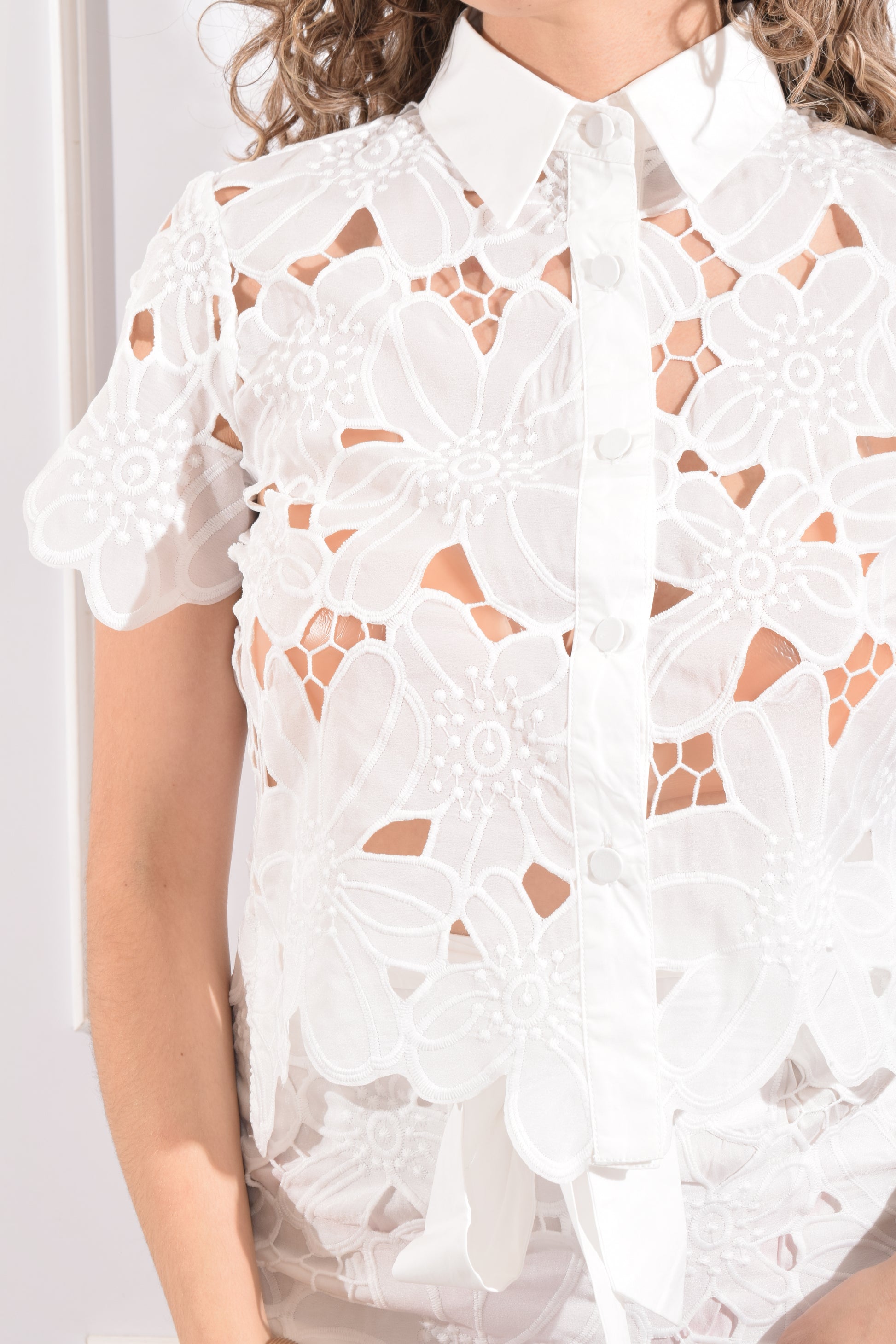 Conjunto tela bordada, blusa corta con botones al frente, manga corta, pantalón con moño en la cintura, cierre al costado, viene con short integrado, tela que no estira.