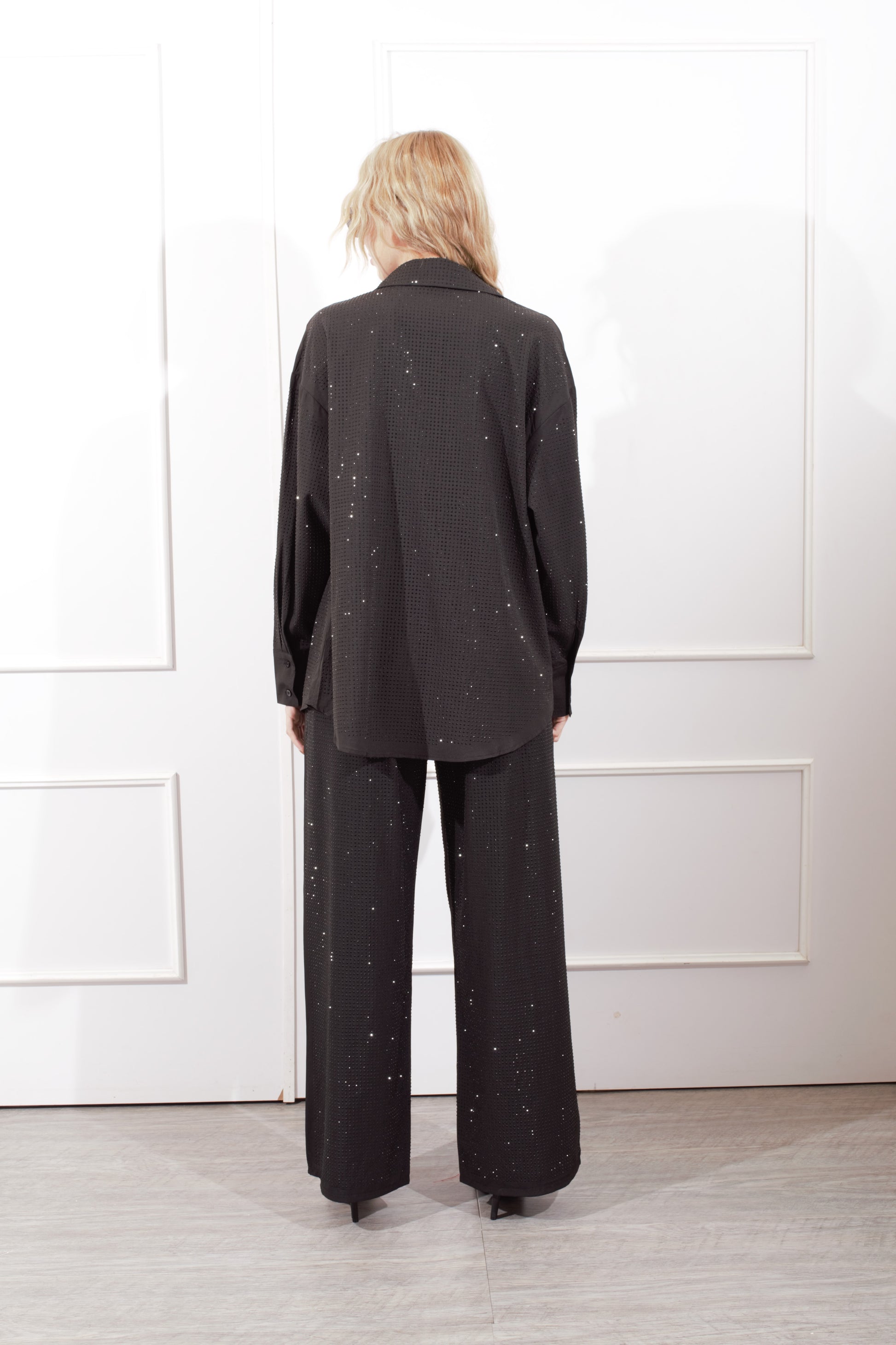 Conjunto todo brillos, tres piezas, top tirantes con resorte en la espalda, Camisera manga larga botones al frente, pantalon con resorte en la cintura, bolsas laterales, tela que no estira.