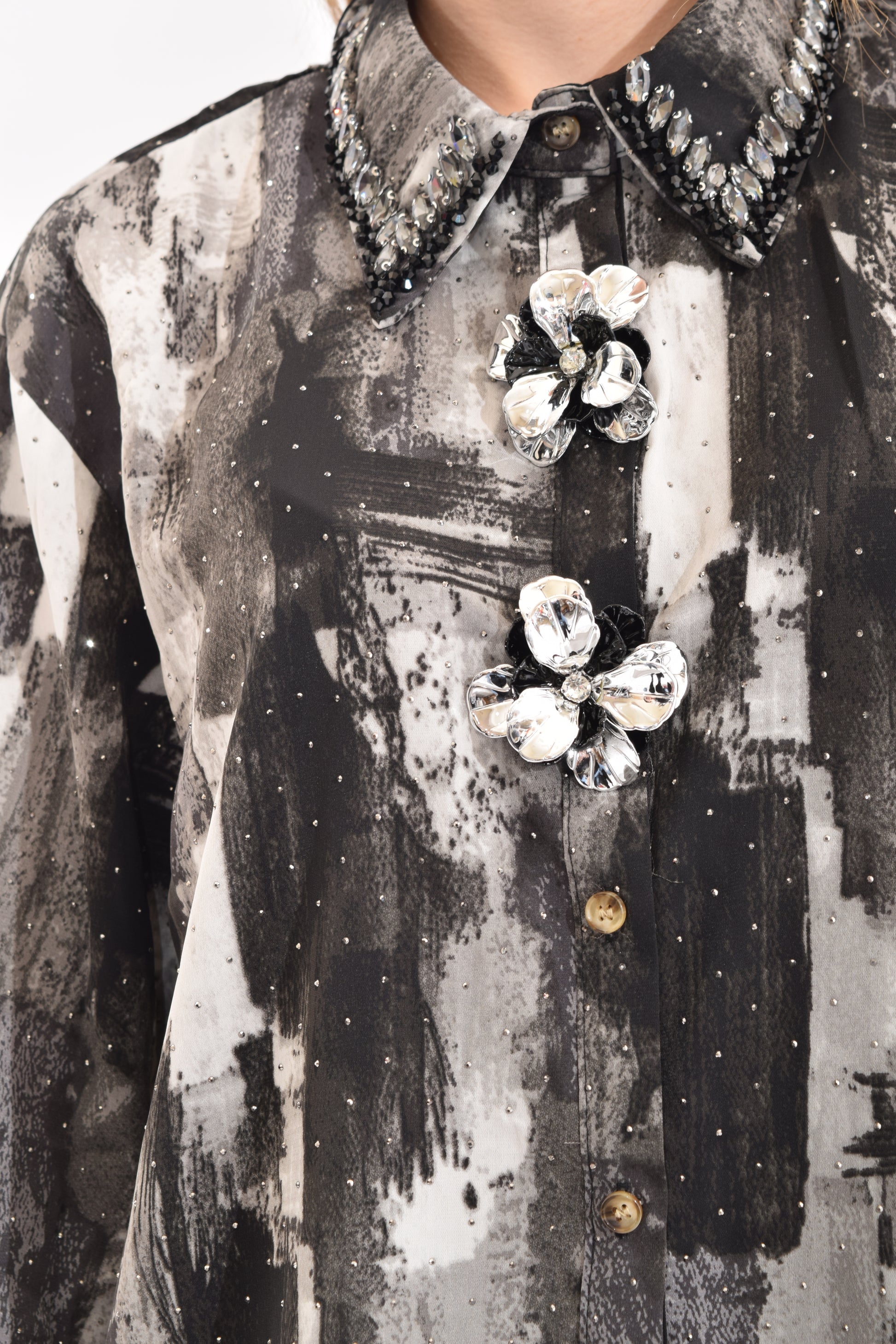 Conjunto estampado, blusa manga larga botones flor grande brillos en el cuello, pantalón con resorte en la cintura y bolsas laterales., tela sin strech