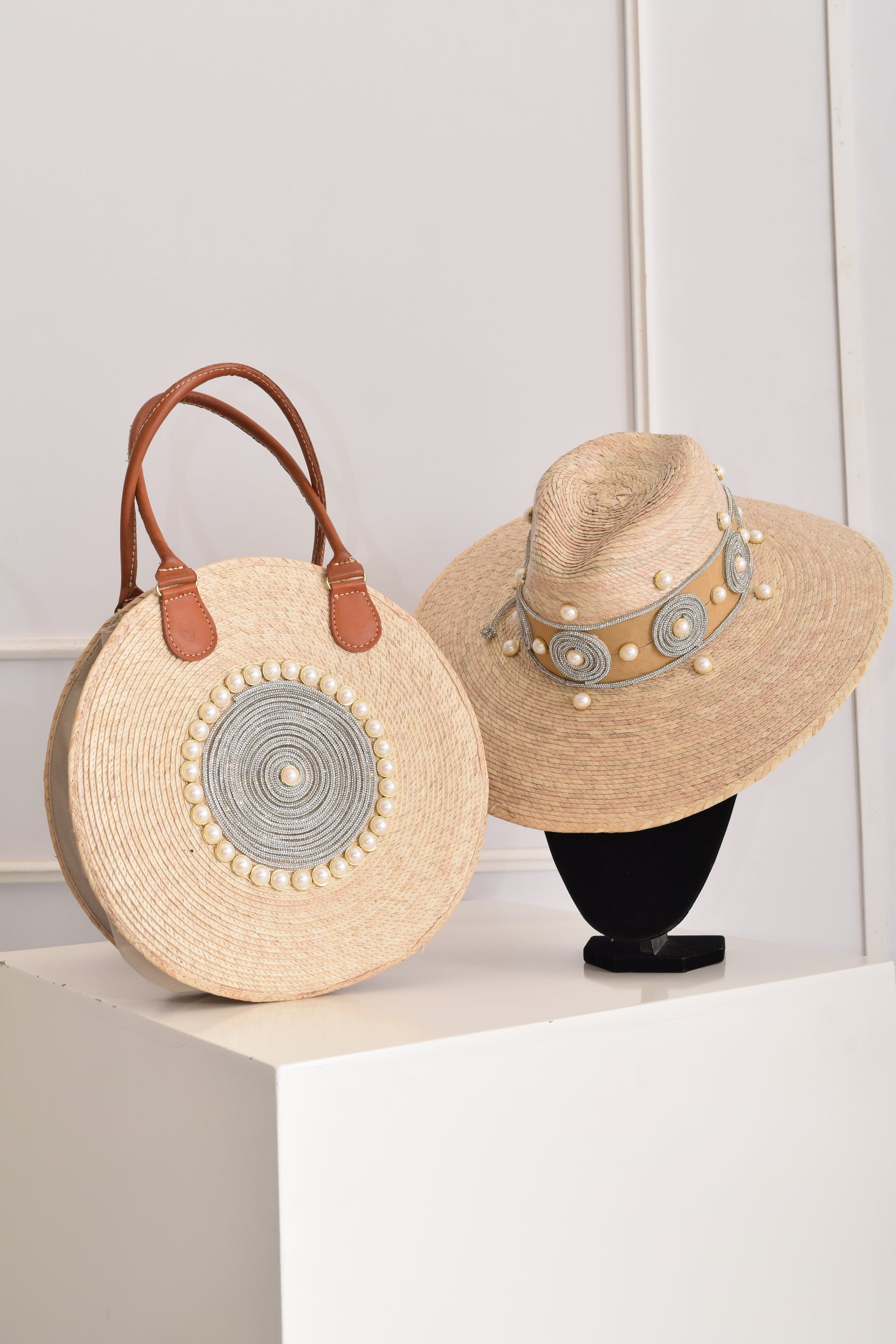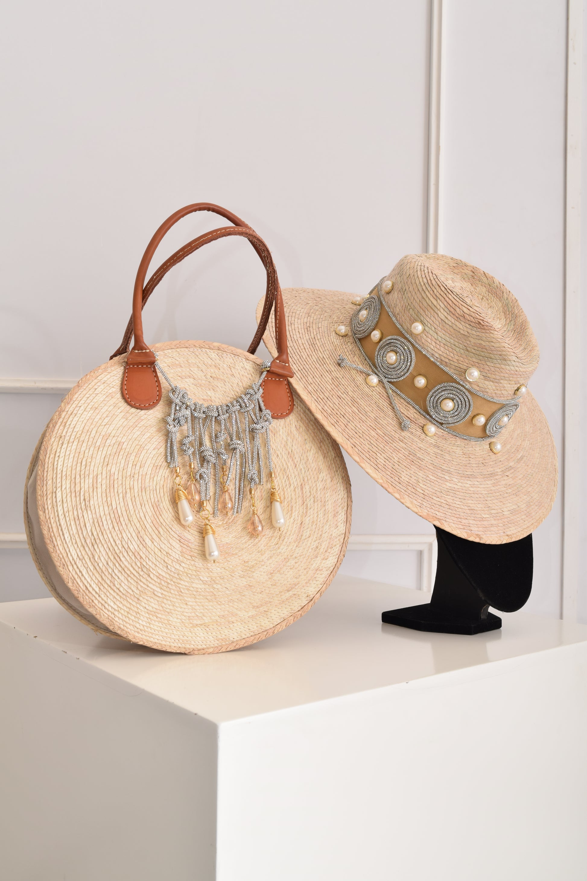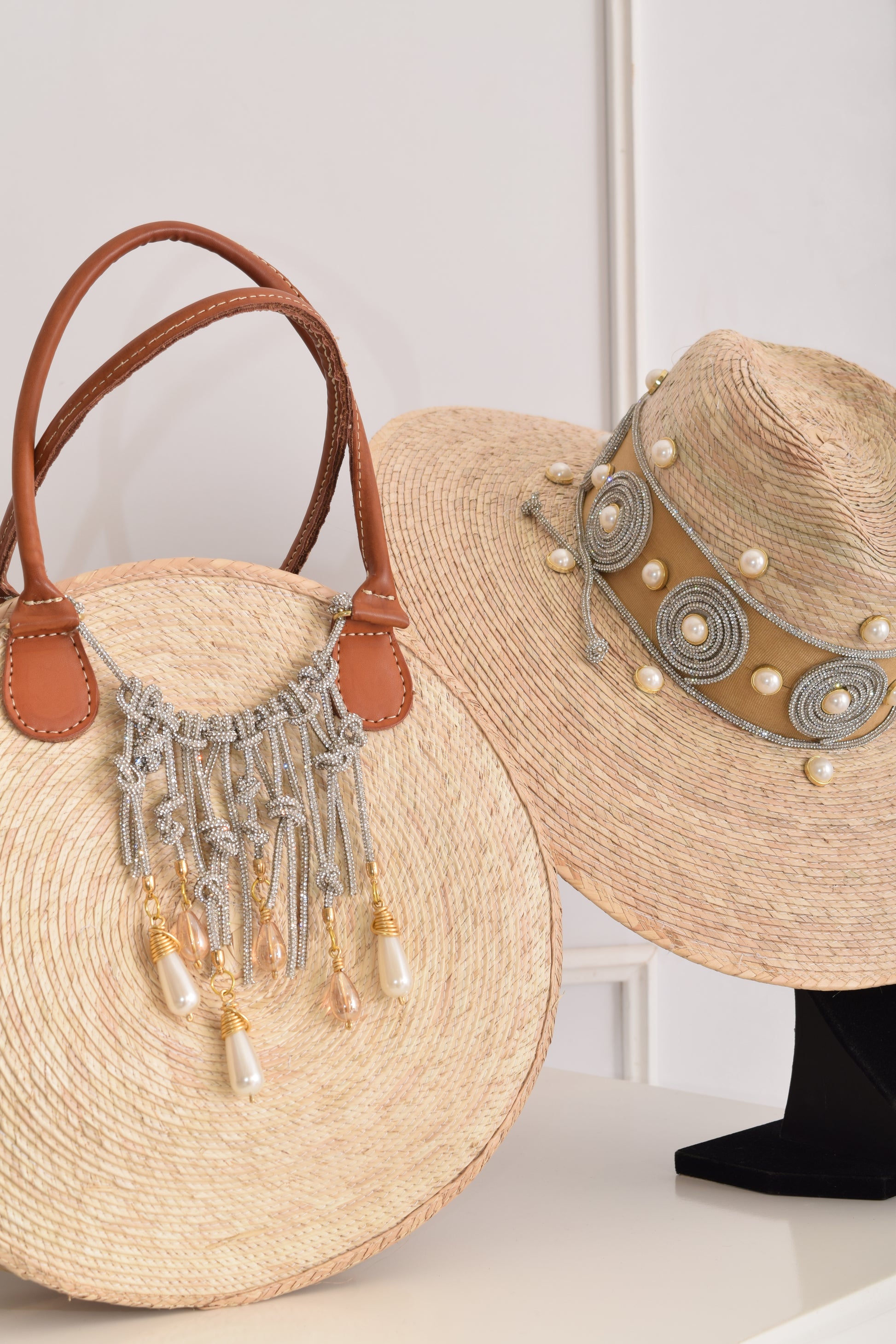 Dúo de Bolsa y sombrero artesanal material de palma y cristal, con distinto diseño por ambos lados.