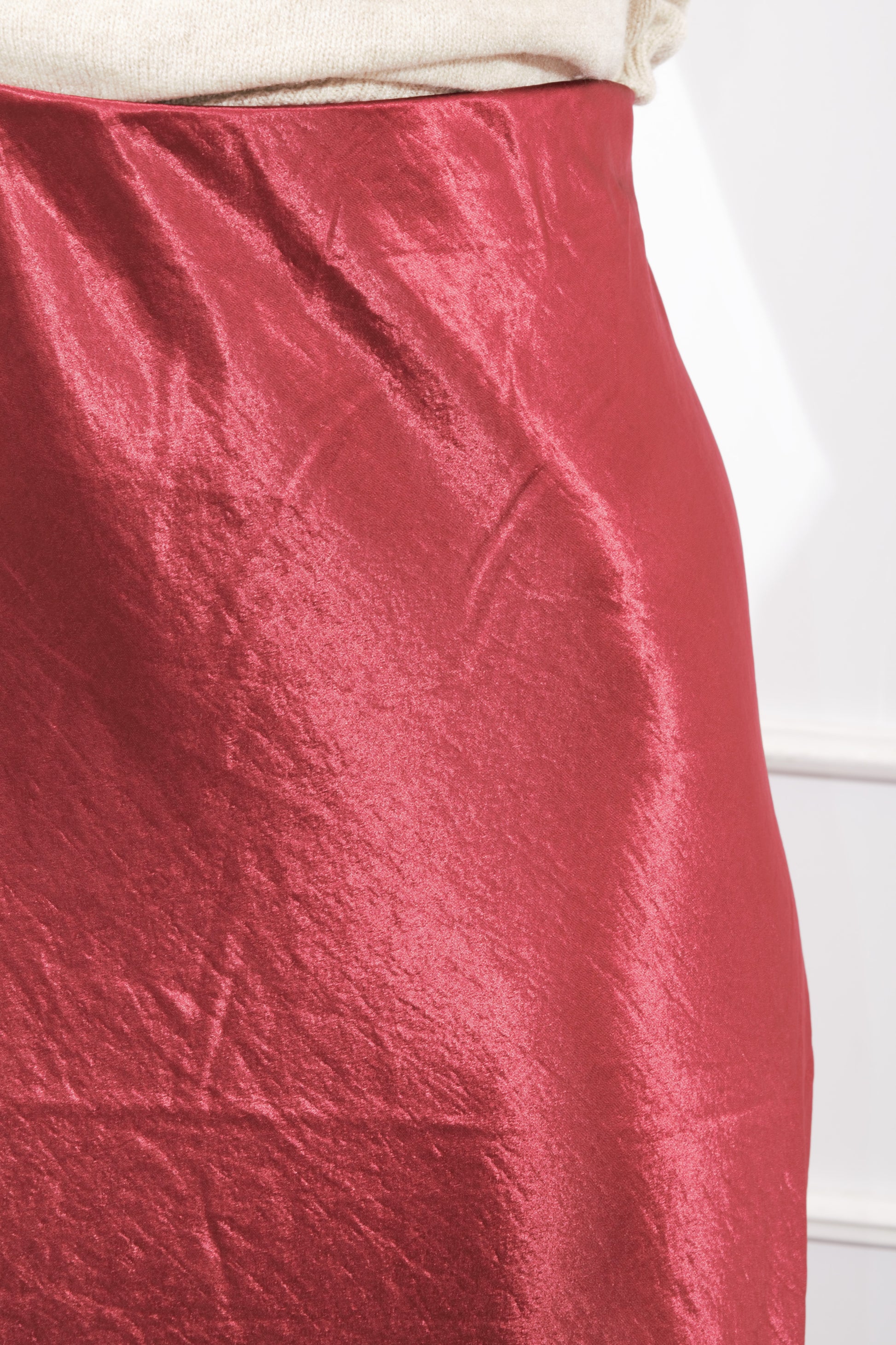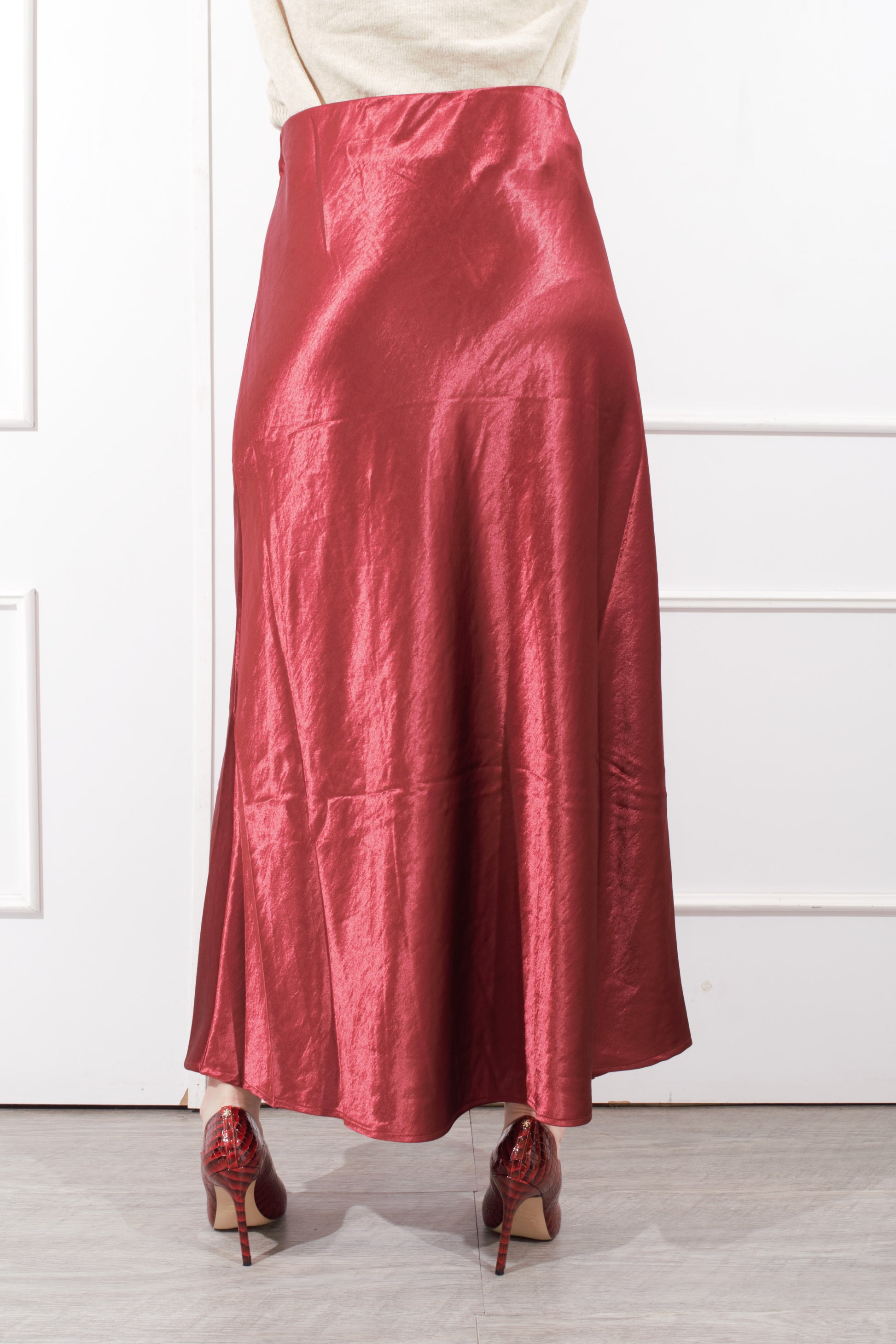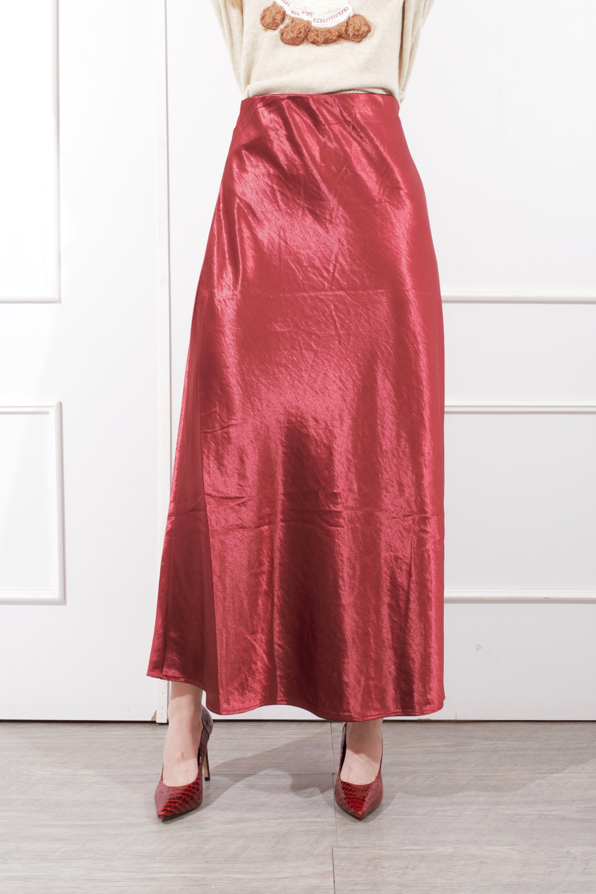 Falda larga satinada, color vino, resorte en la cintura. tela con suficiente strech