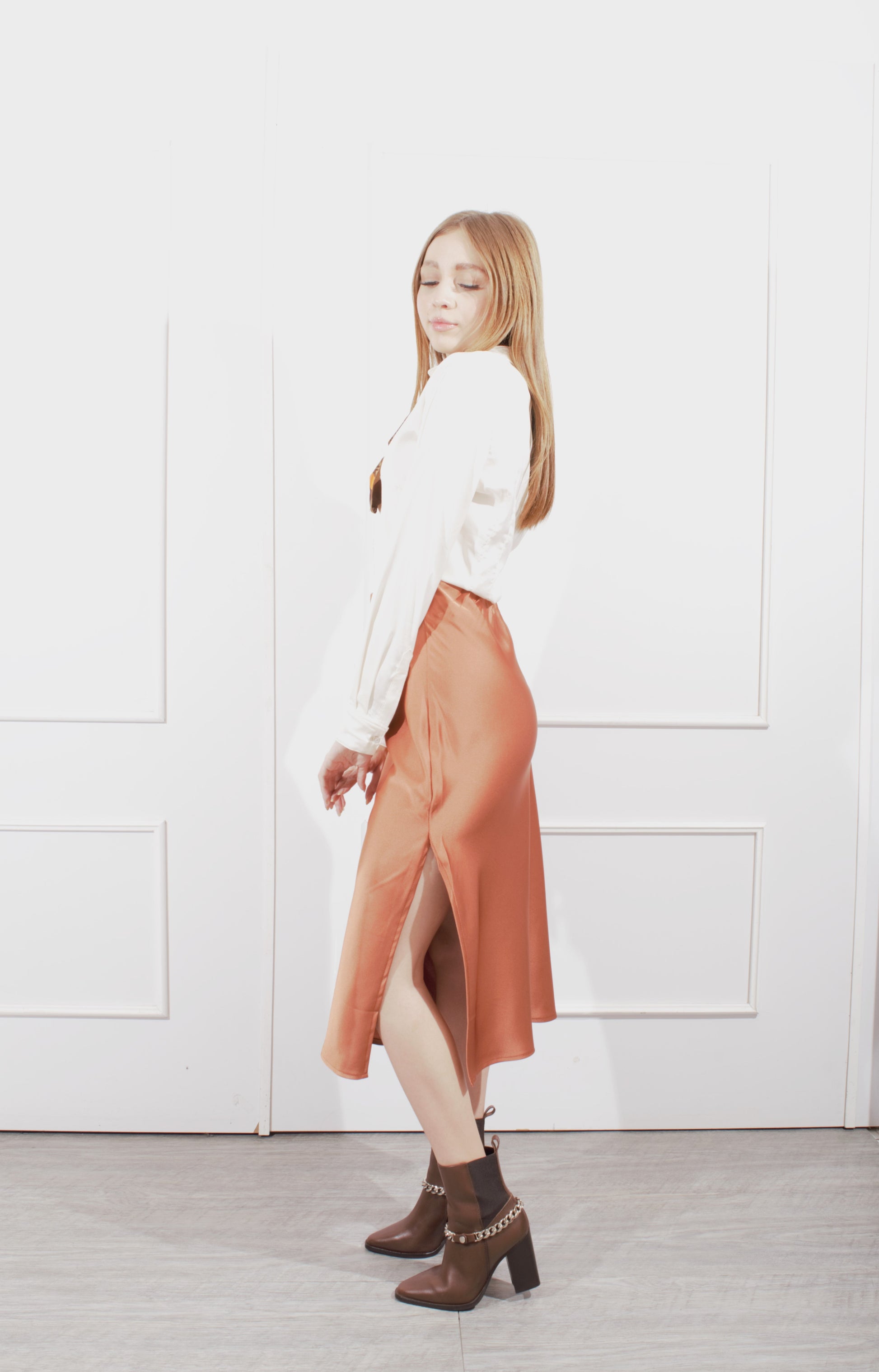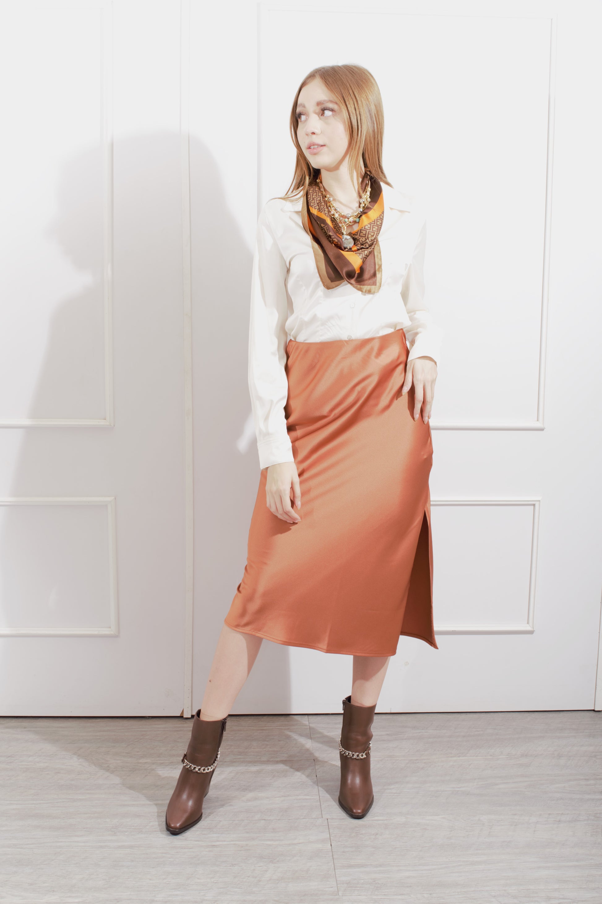 Falda Satinada, resorte en la cintura, abierta costado, tela con suficiente strech.