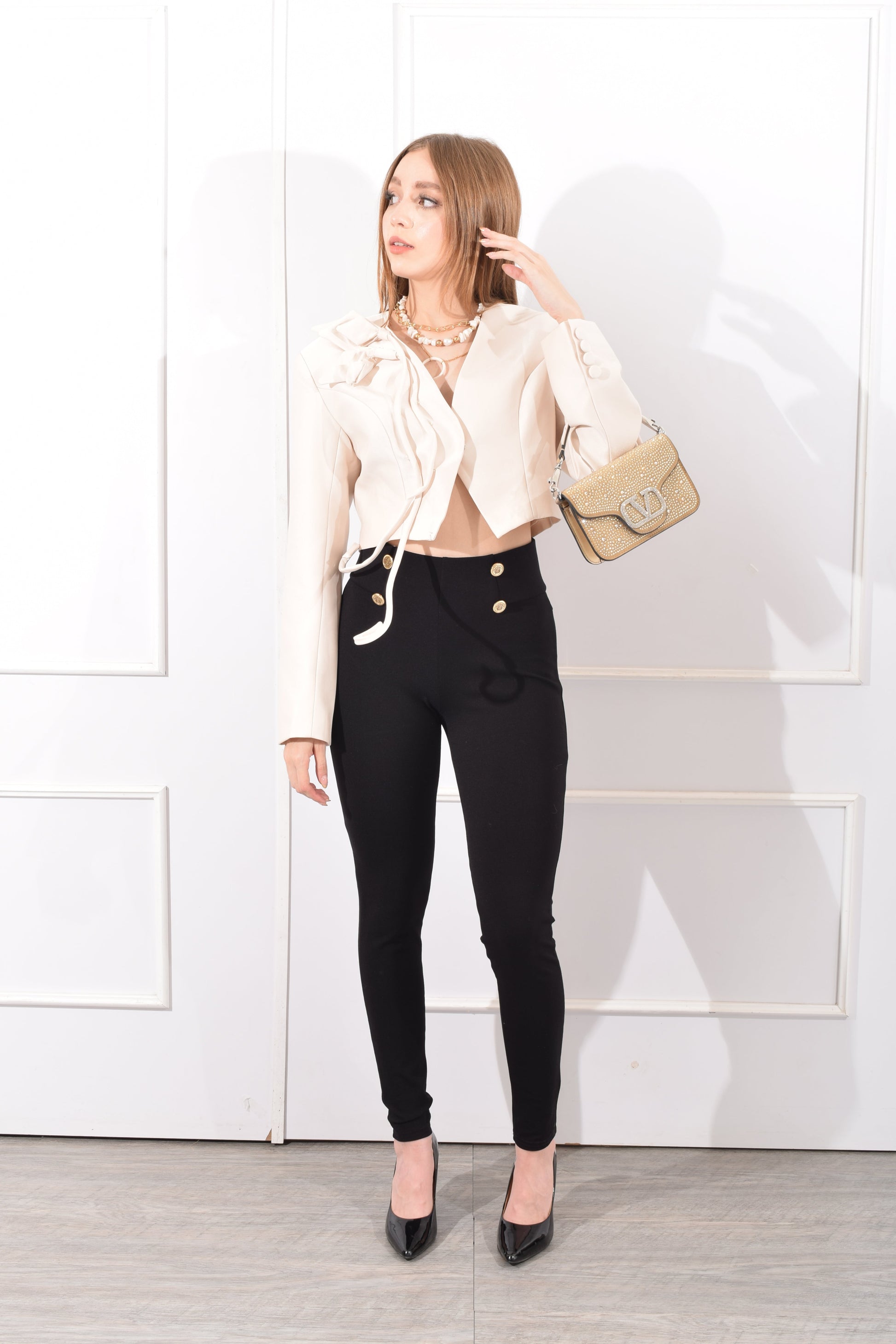Saco corto detalle de tulipán 3D, forrado totalmente, tela que no estira.