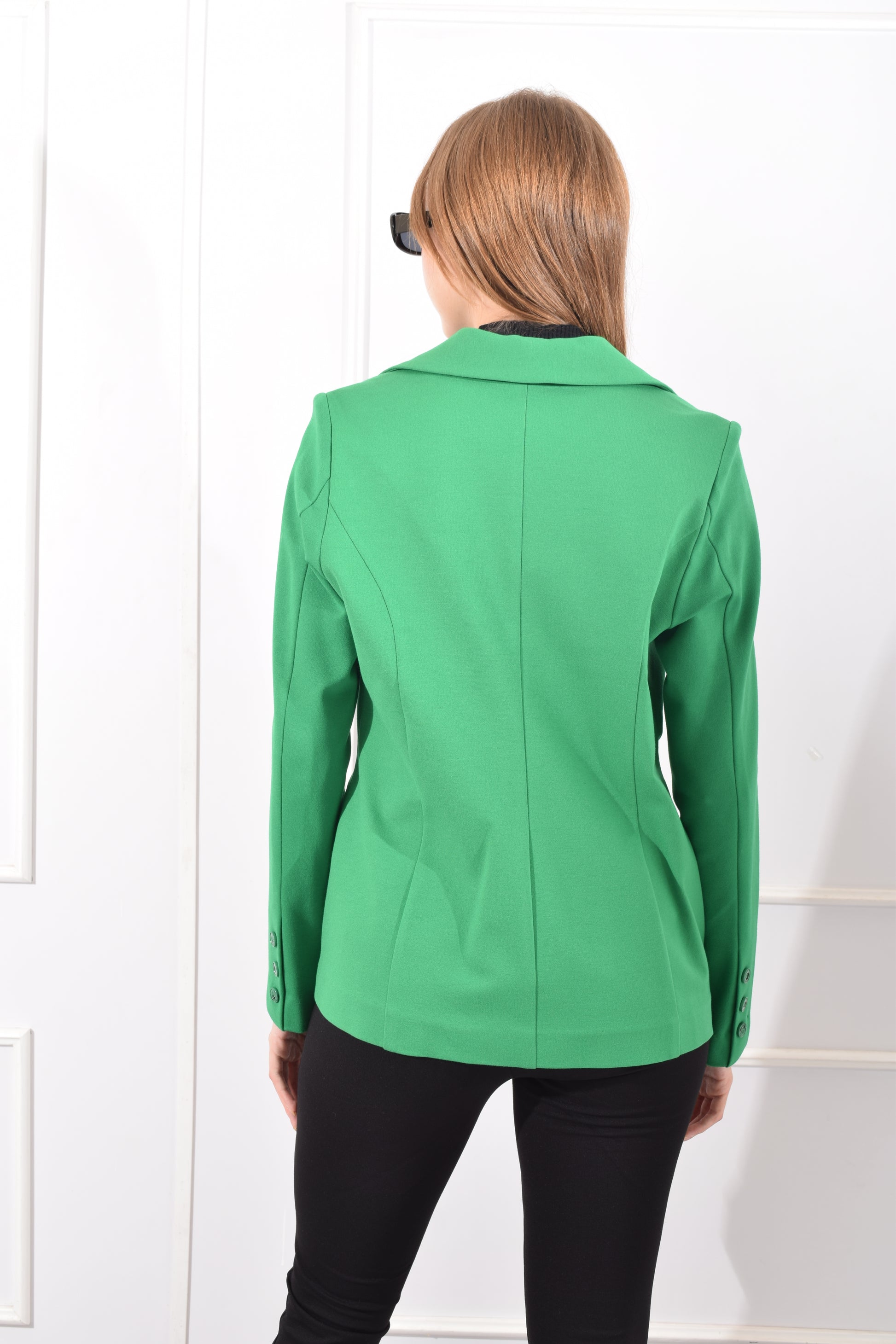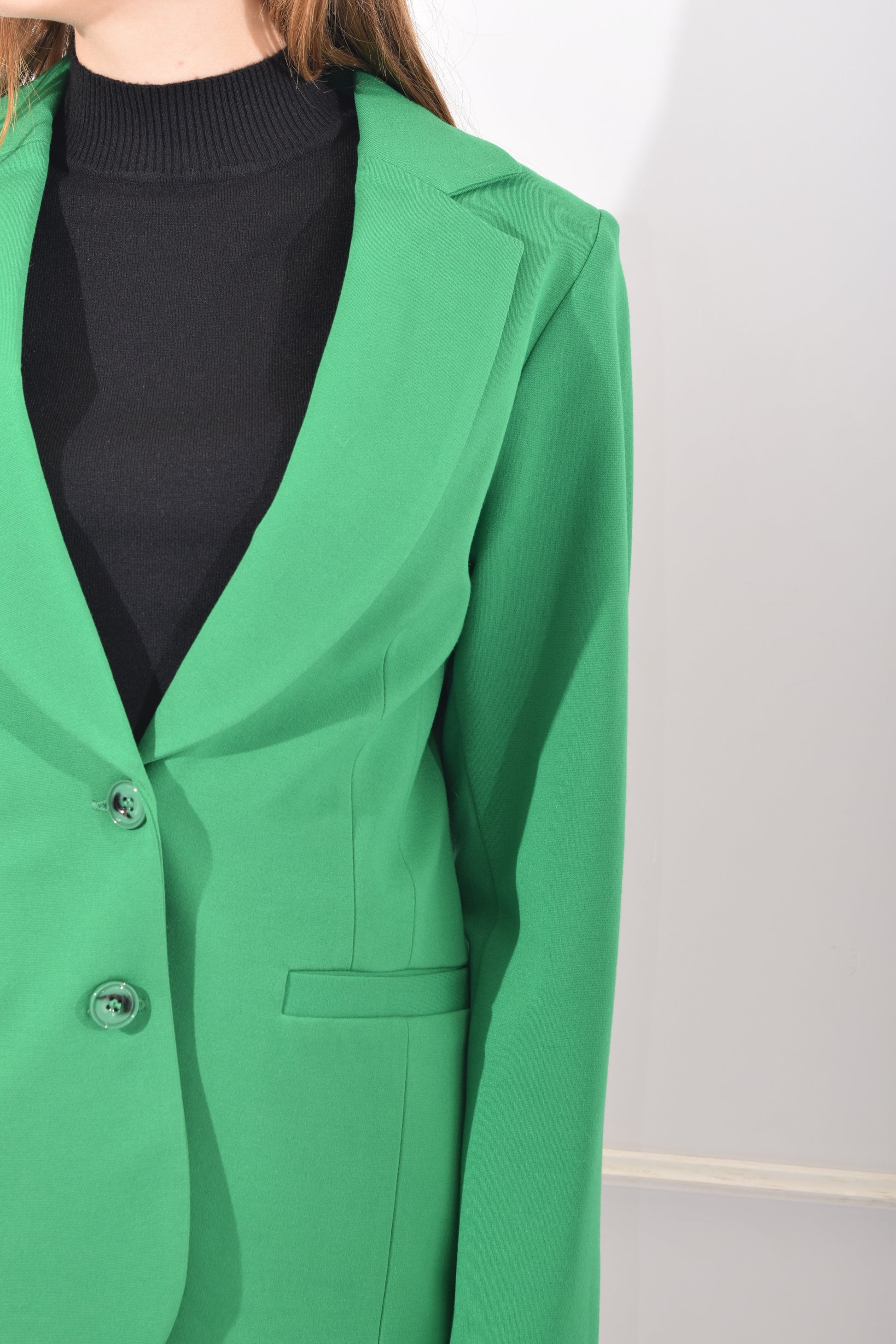 Saco dos botones al frente, tiene bolsas, el frente viene con forro, no estira la parte del frente por el forro que tiene, la parte trasera si estira suficiente.