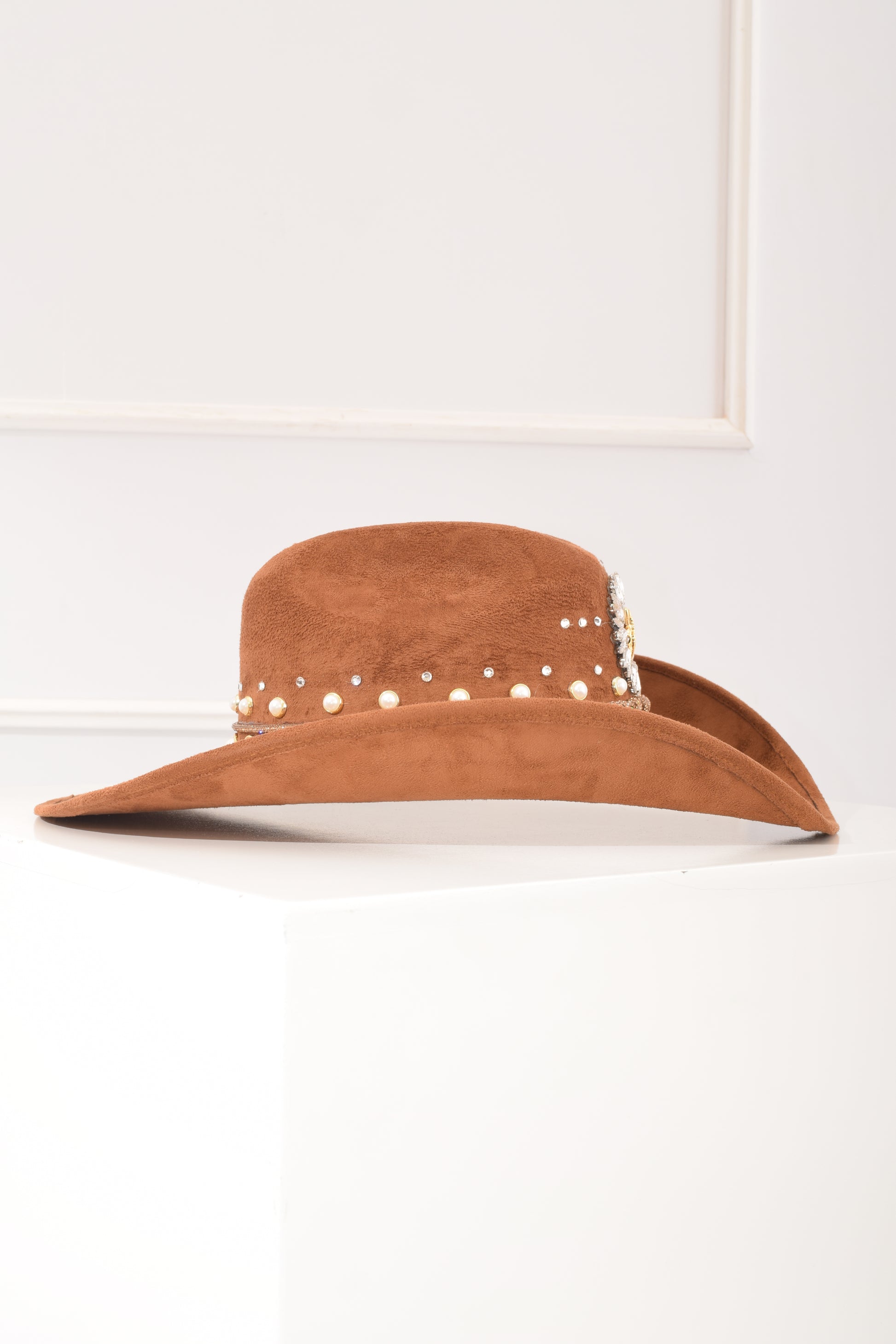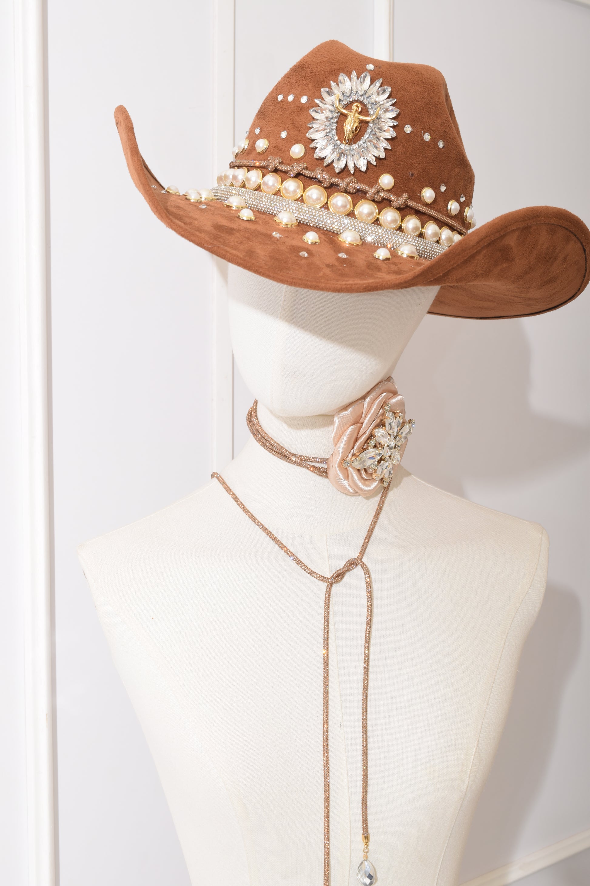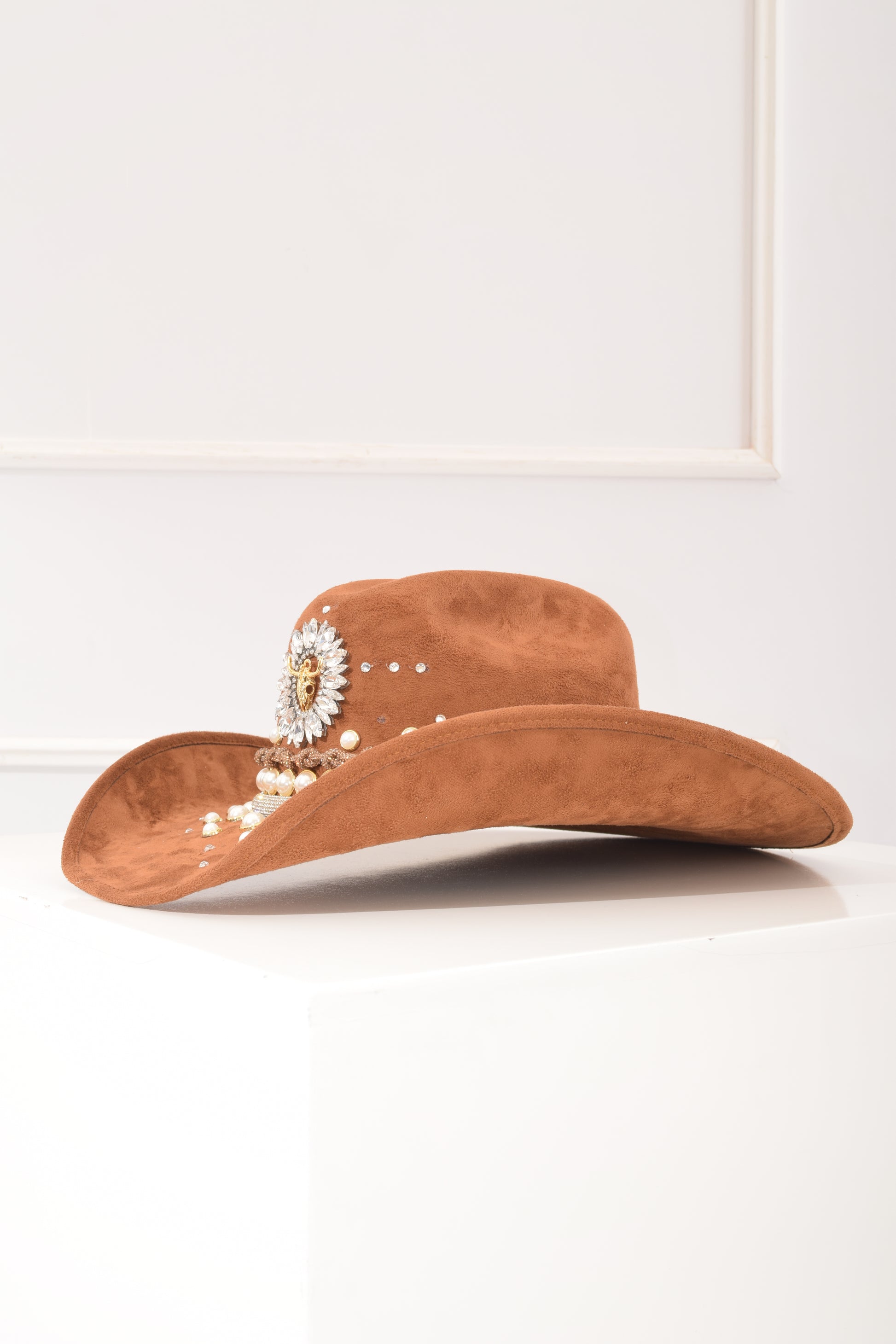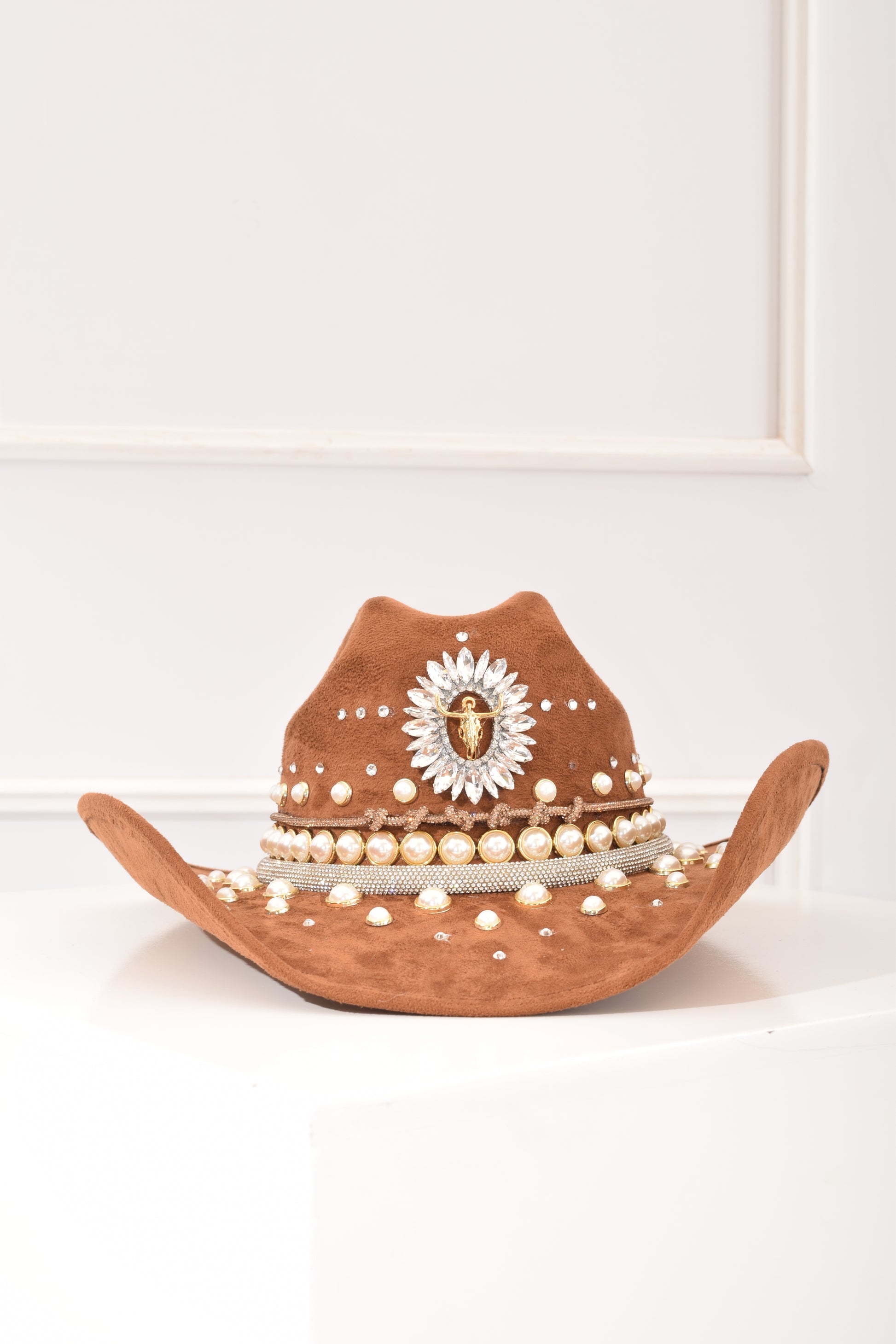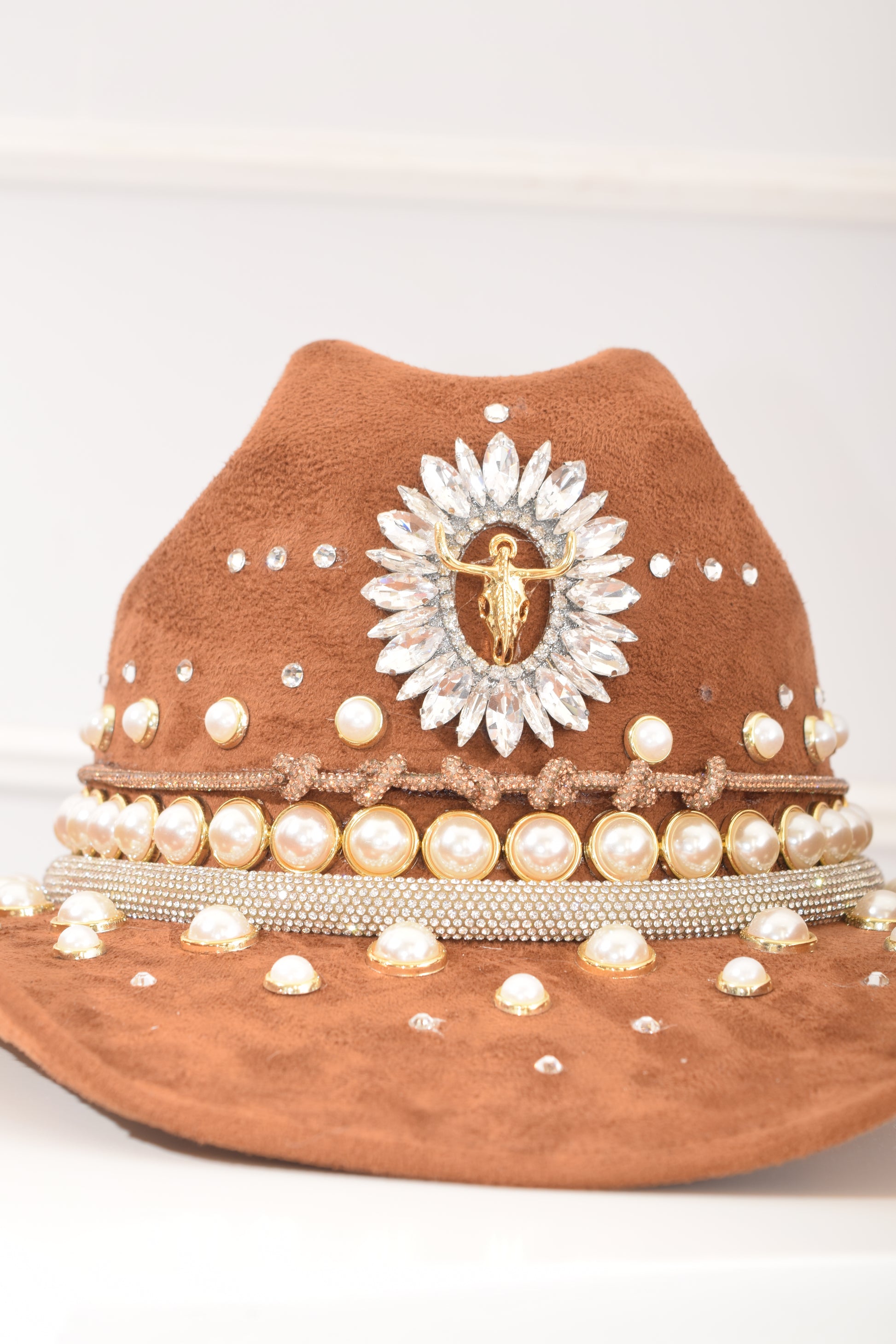 Sombrero camell, cabeza de toro, decorado con cristal media perla y estoperoles, muy en tendencia.