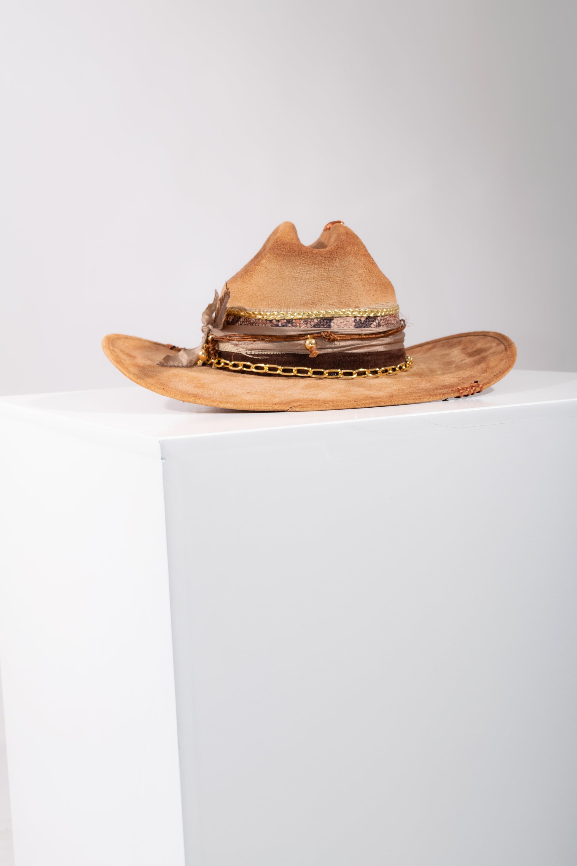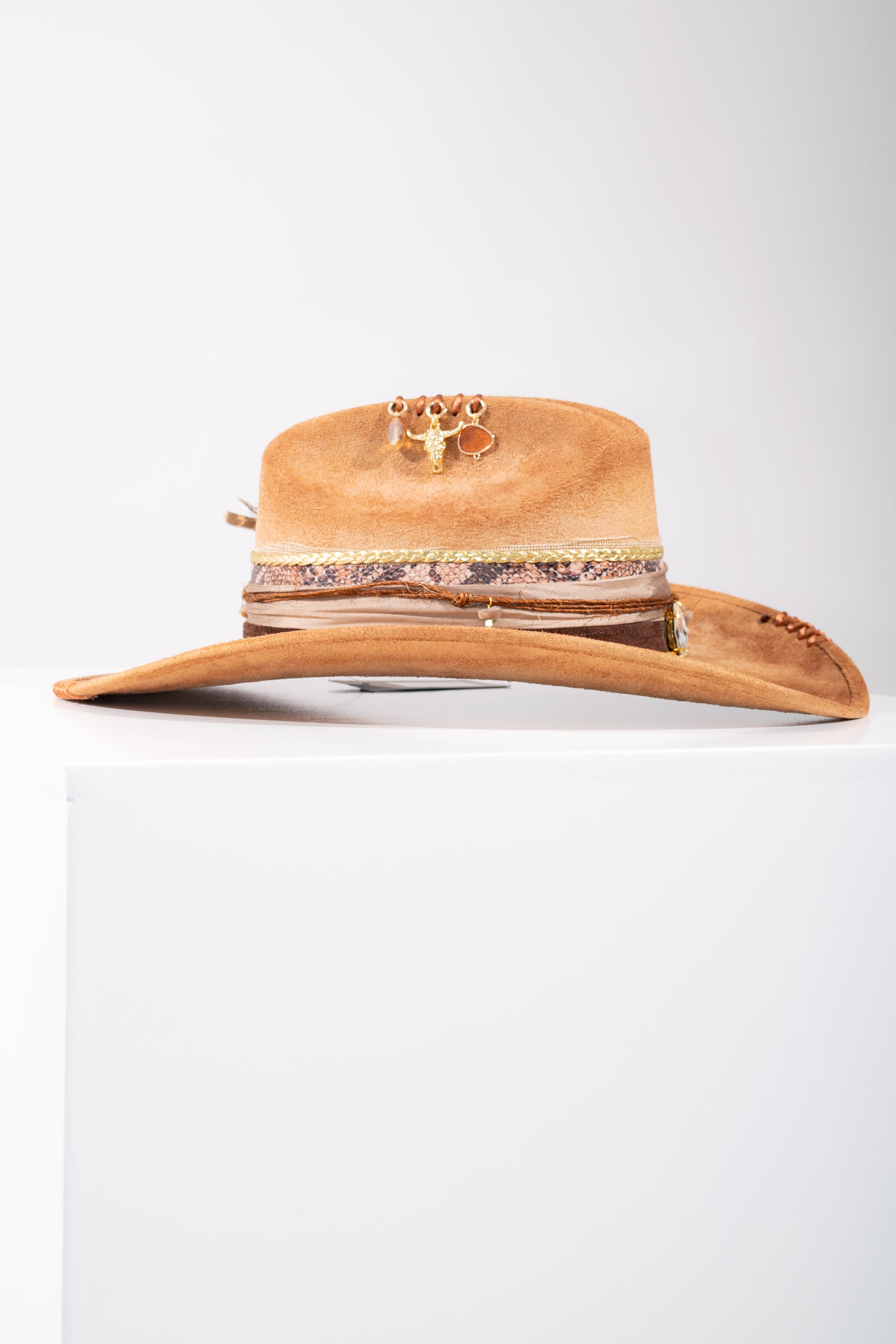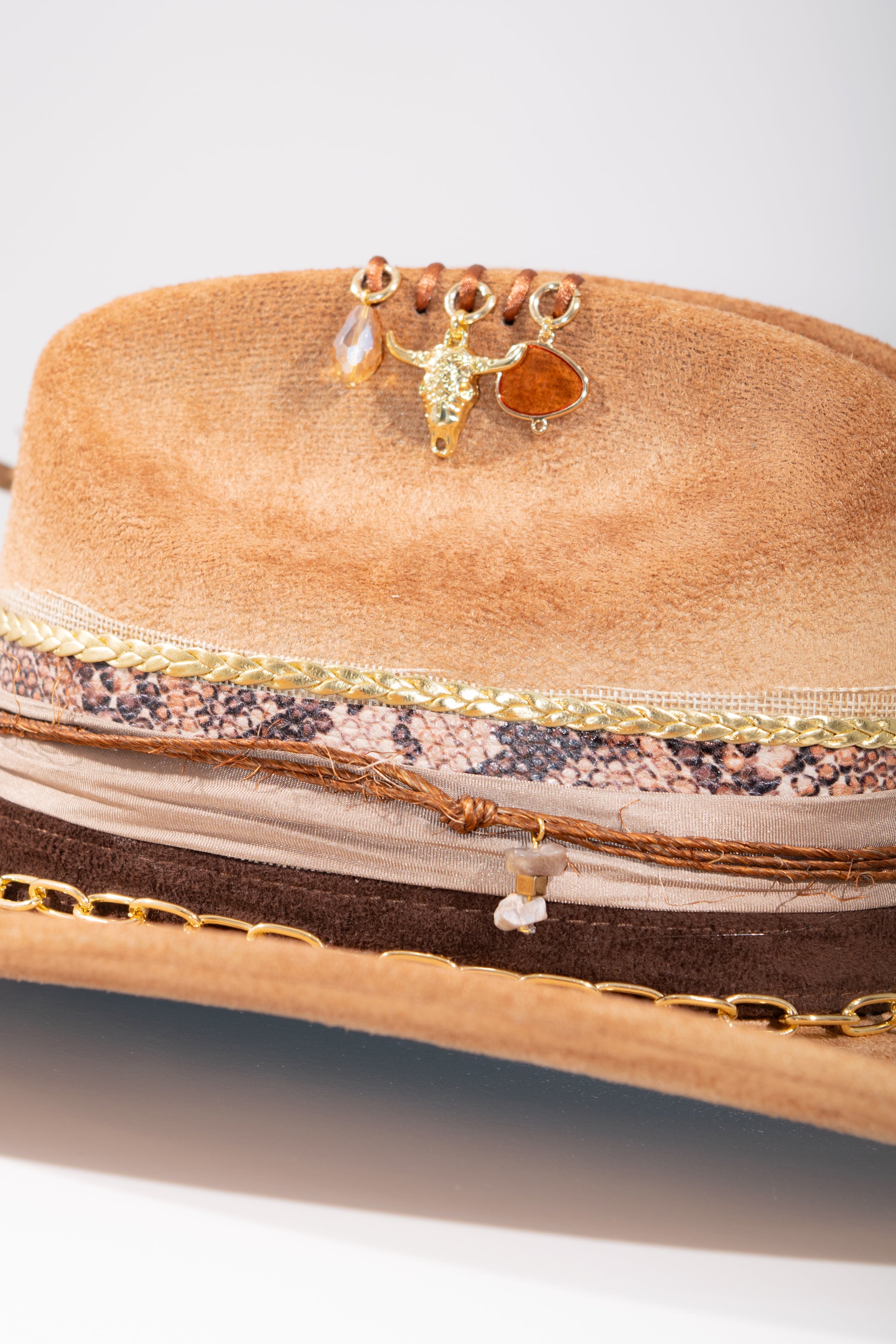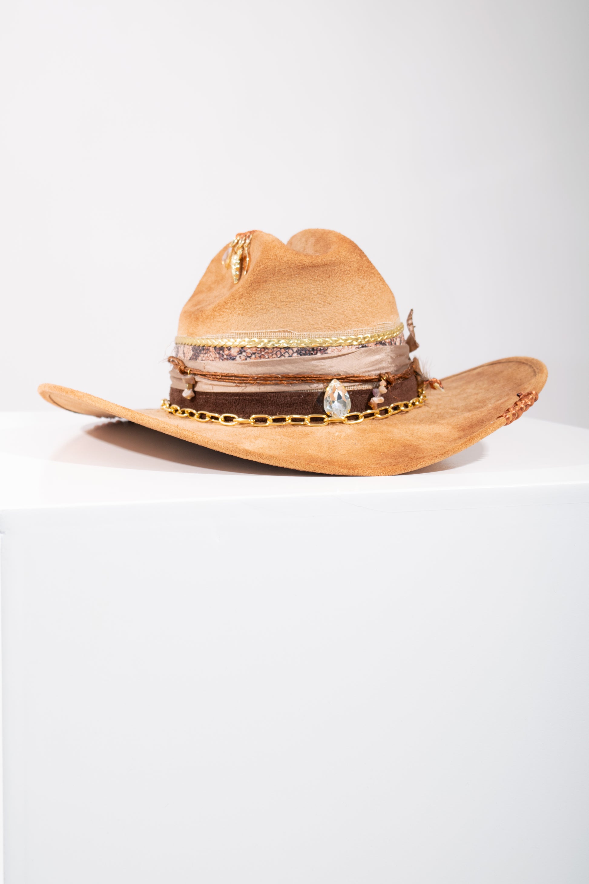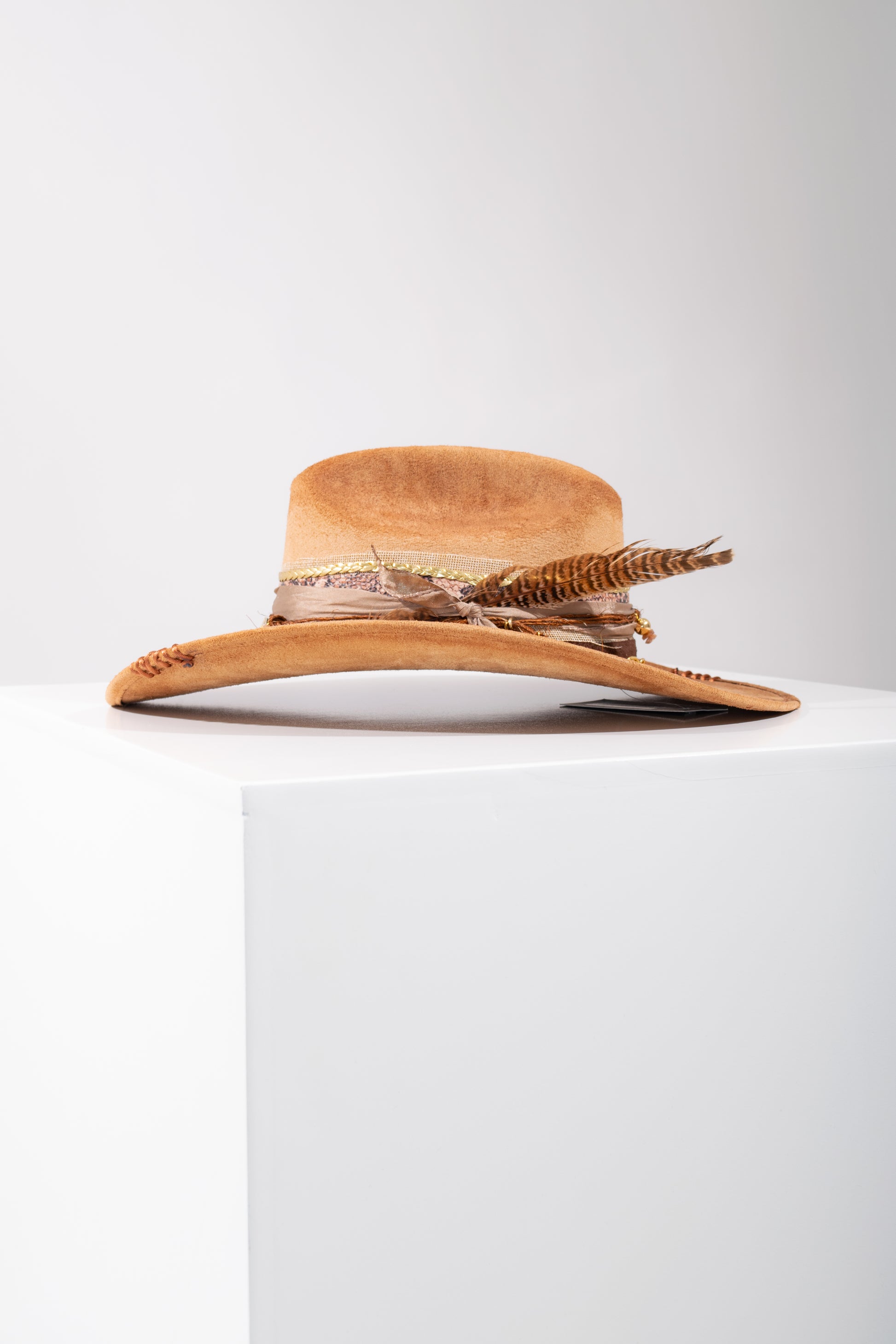 Sombrero tipo Gamuza, decorado con plumas de fantasía y brillos de cristal. La Decoración es totalmente hecho a mano.