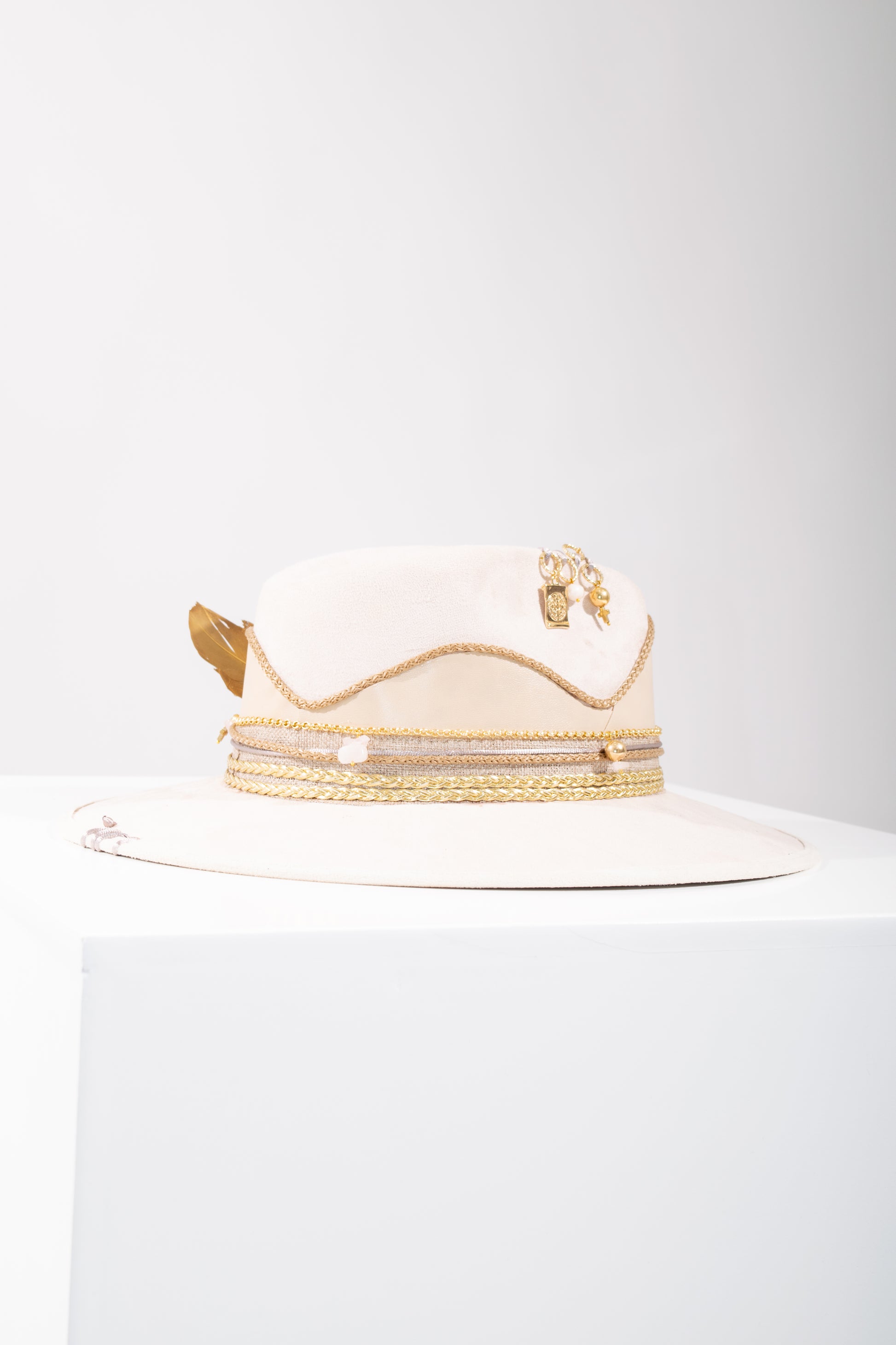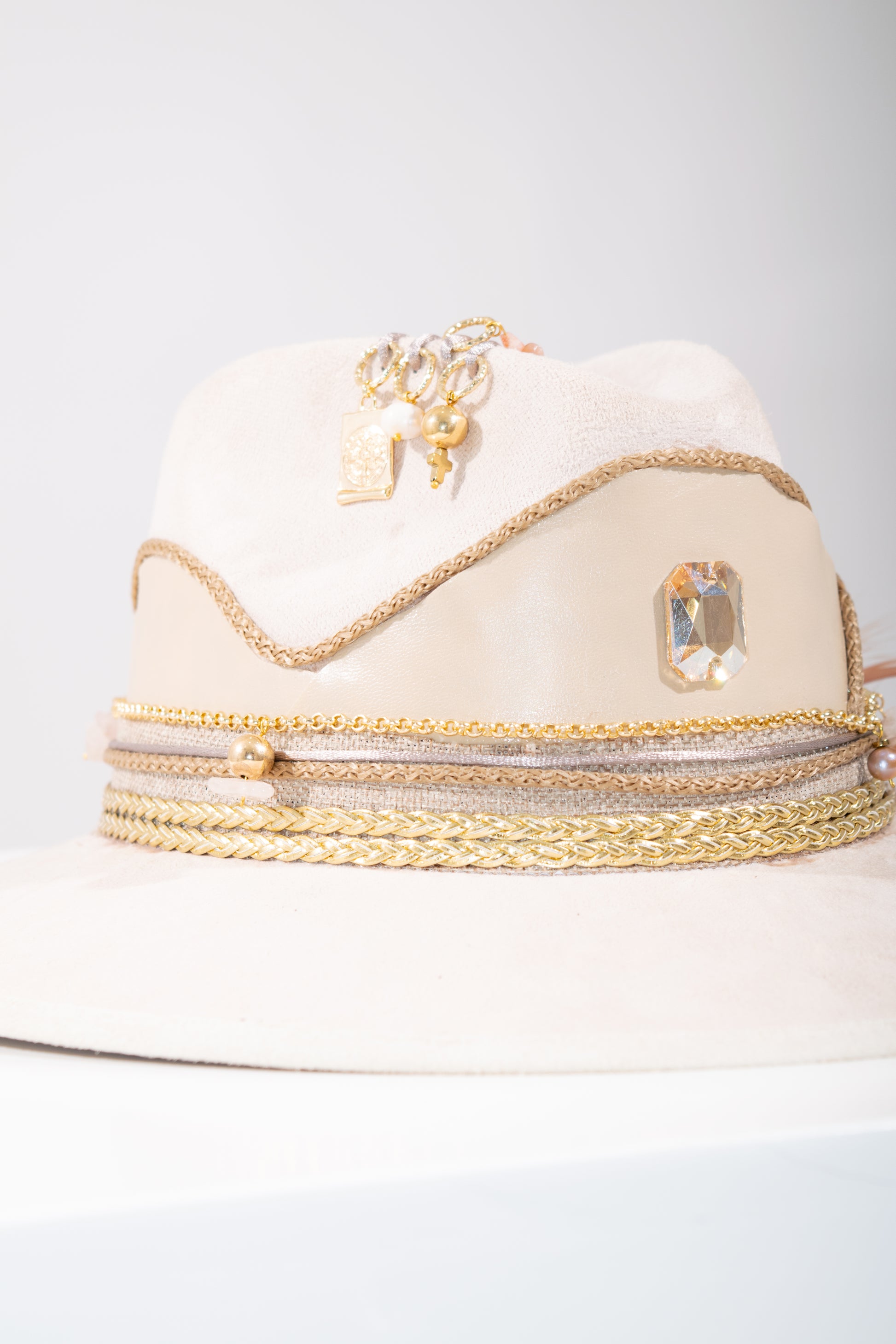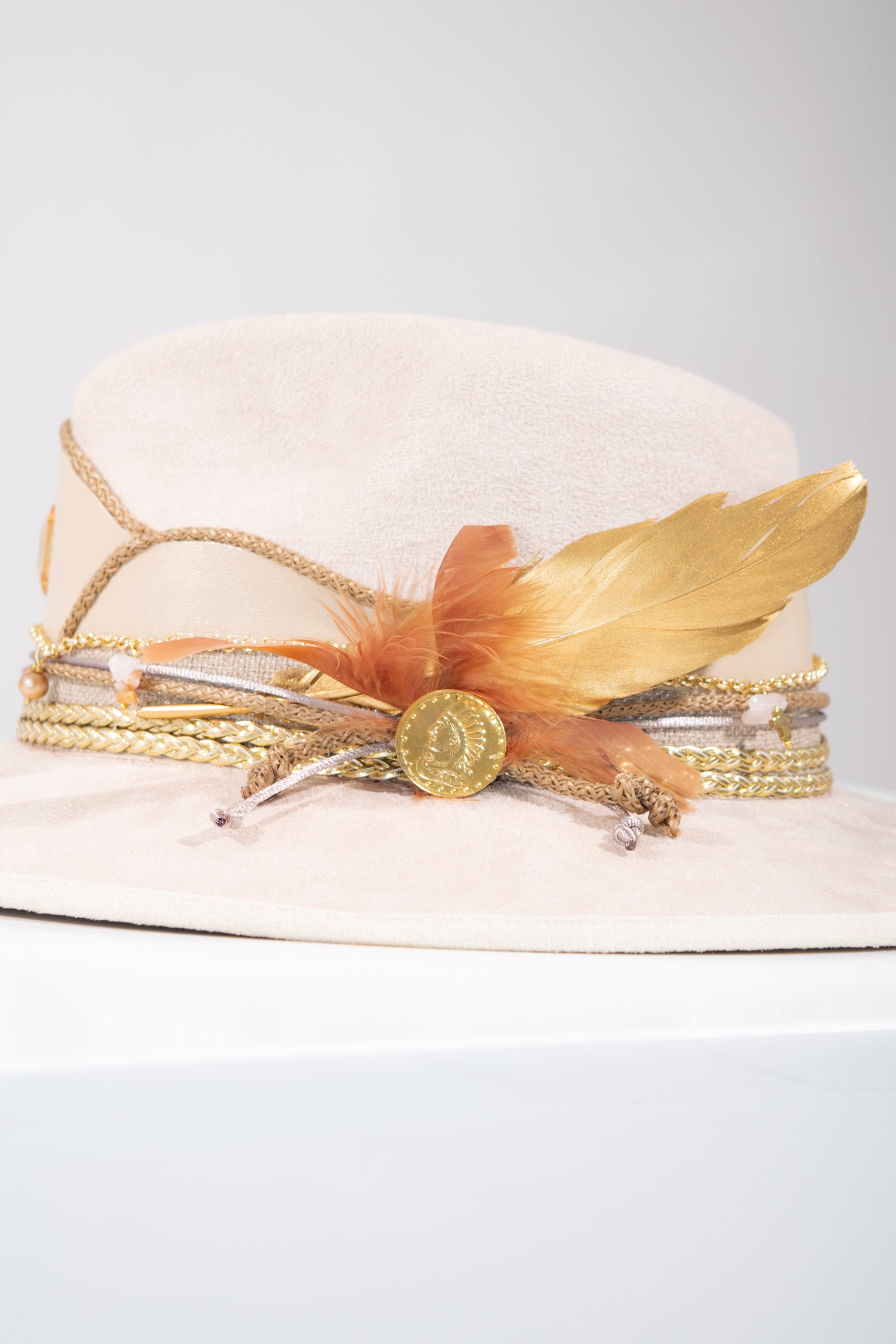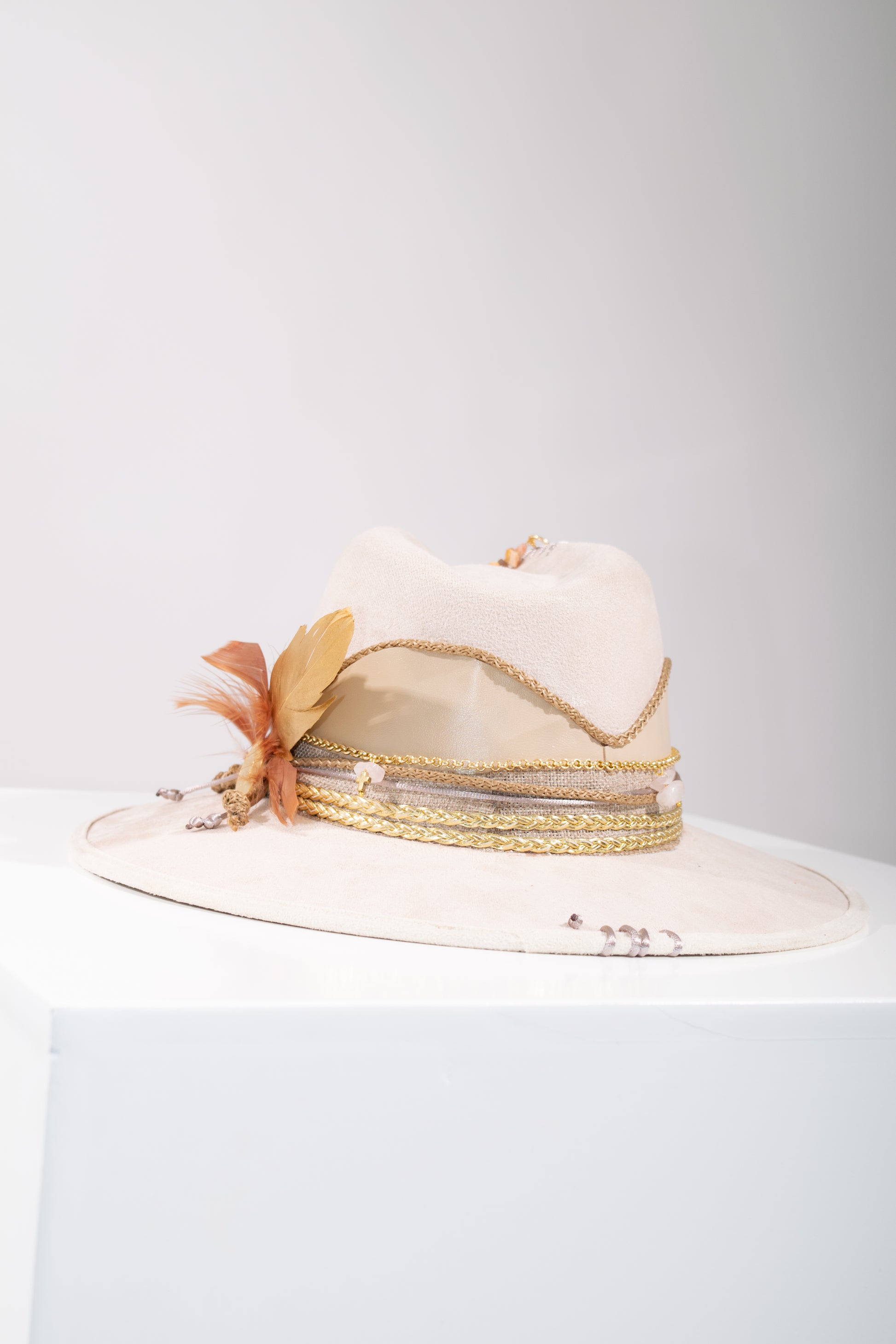 Sombrero tipo Gamuza, decorado con plumas de fantasía y brillos de cristal. La Decoración es totalmente hecho a mano.