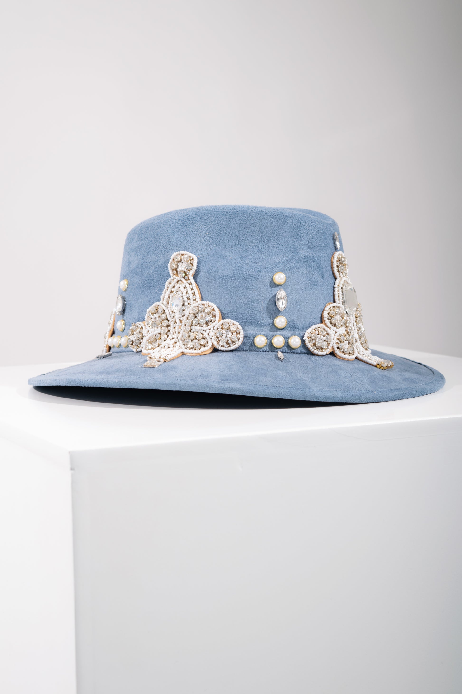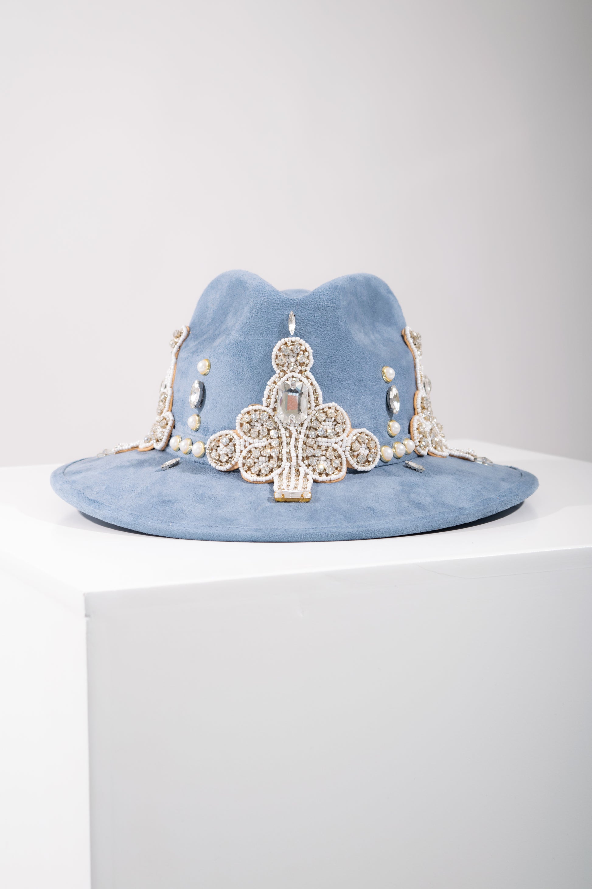 Sombrero tipo Gamuza, decorado con plumas de fantasía y brillos de cristal. La Decoración es totalmente hecho a mano.