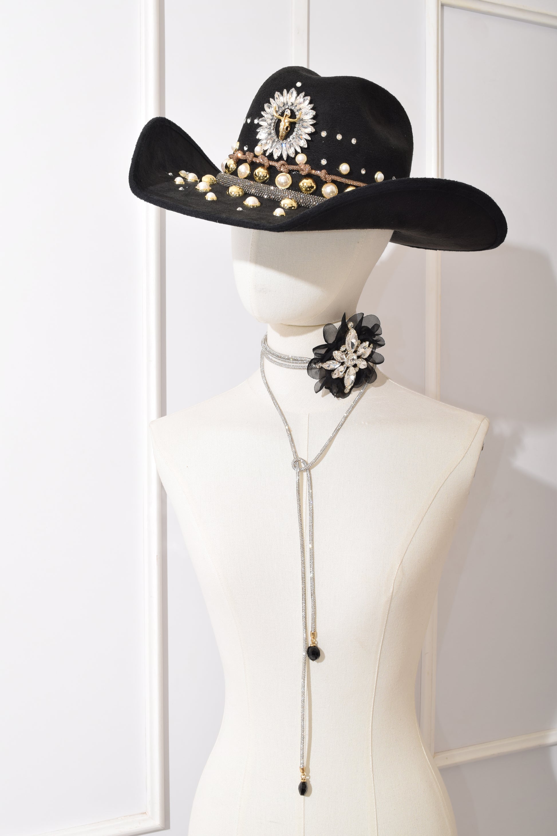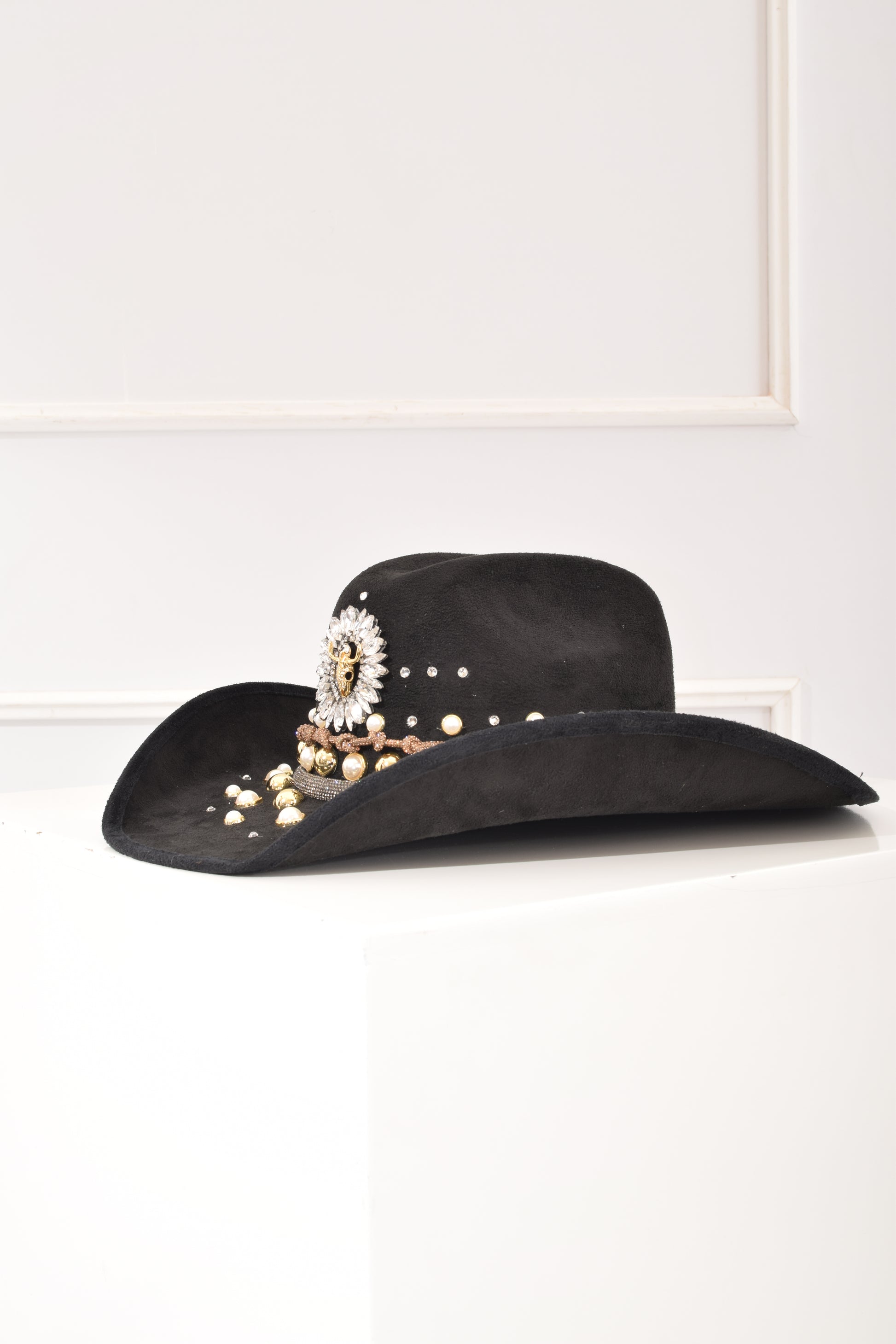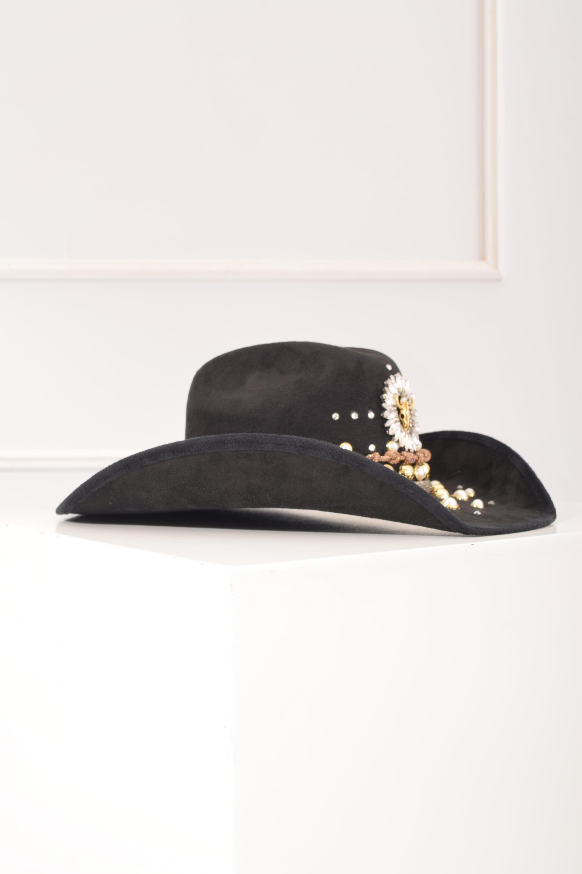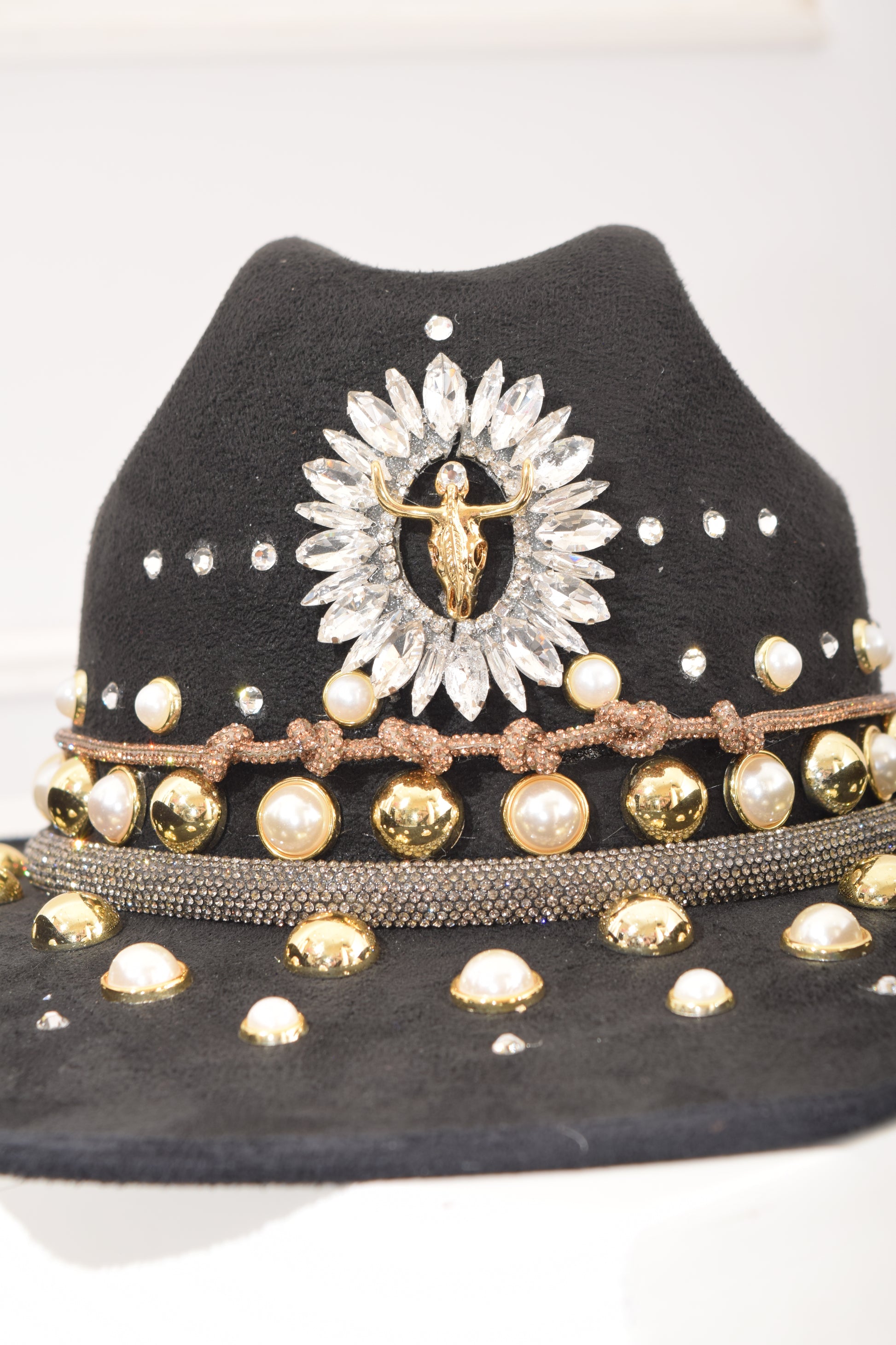 Sombrero negro, trabajo artesanal decorado con cabeza de toro al centro, detalles de cristal medias perlas, estoperoles, modelos en super tendencia.