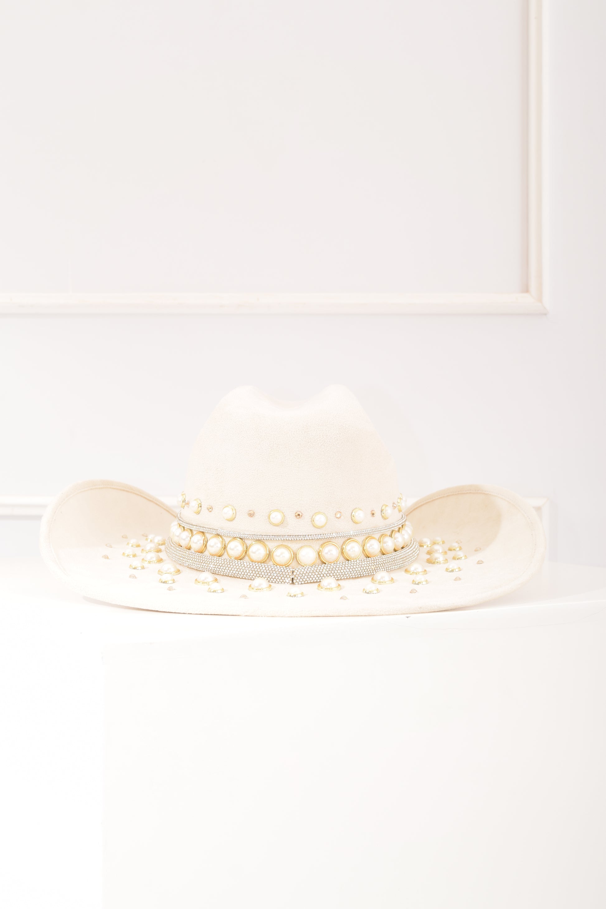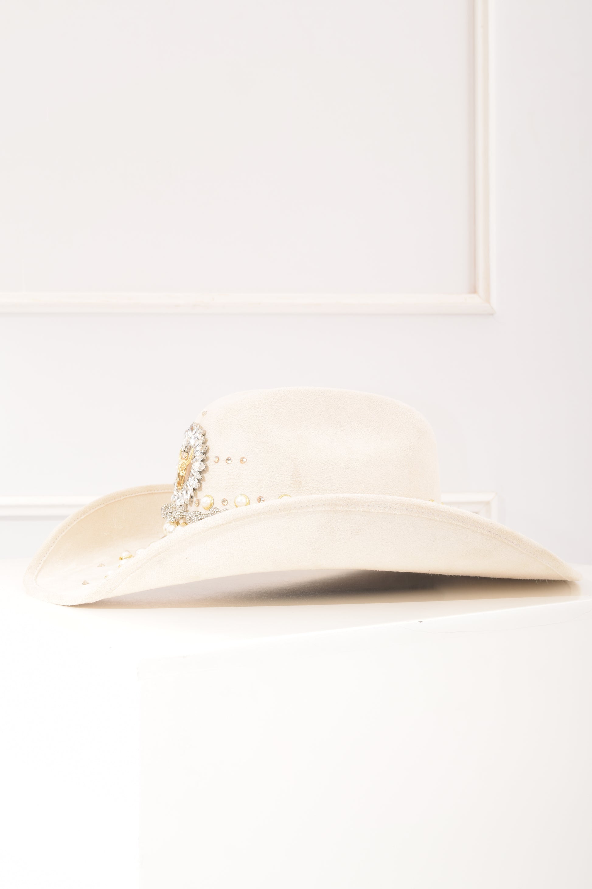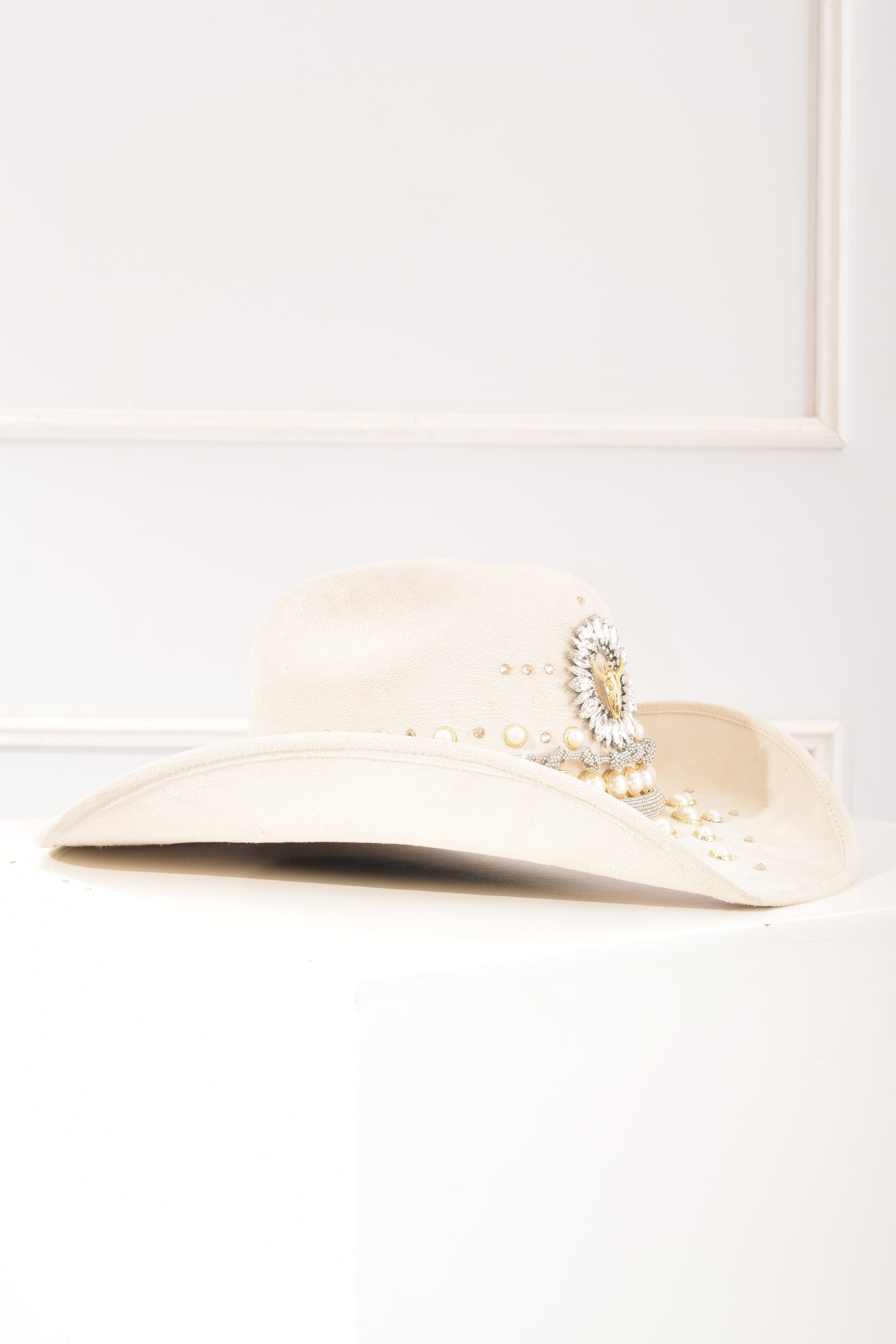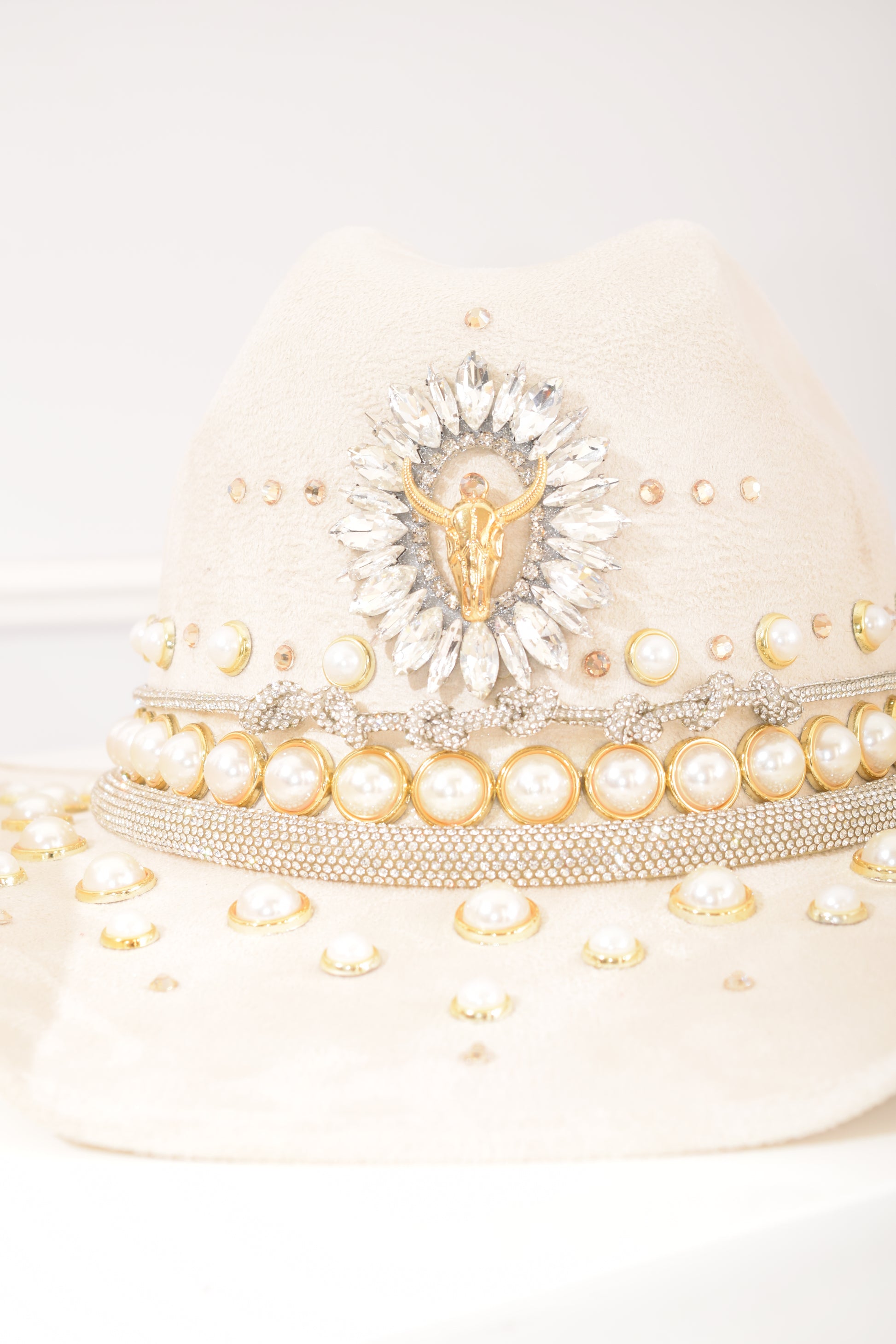Sombrero Beige Toro Perlas y brillos, accesorios en tendecia, trabajo artesanal hecho en México.