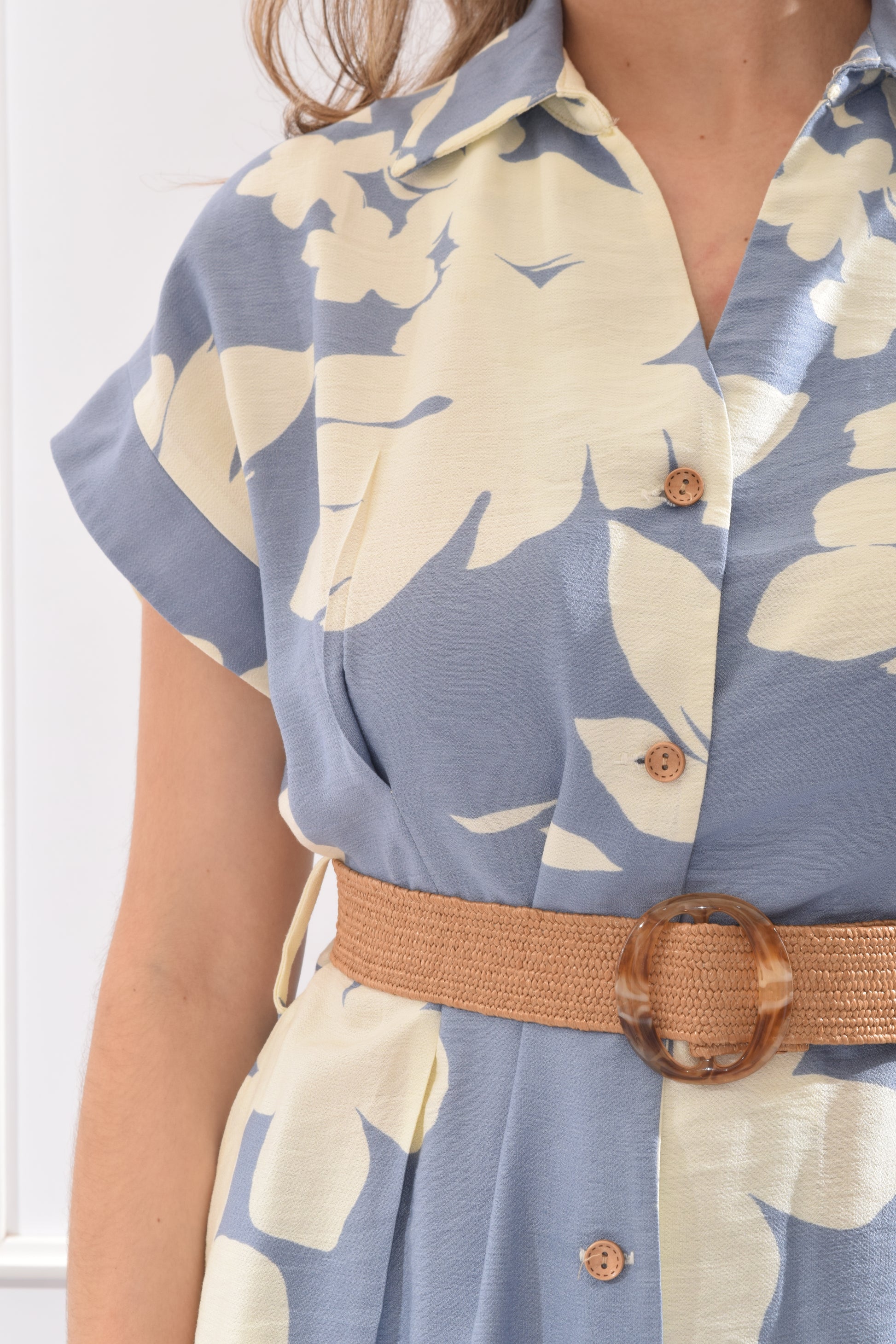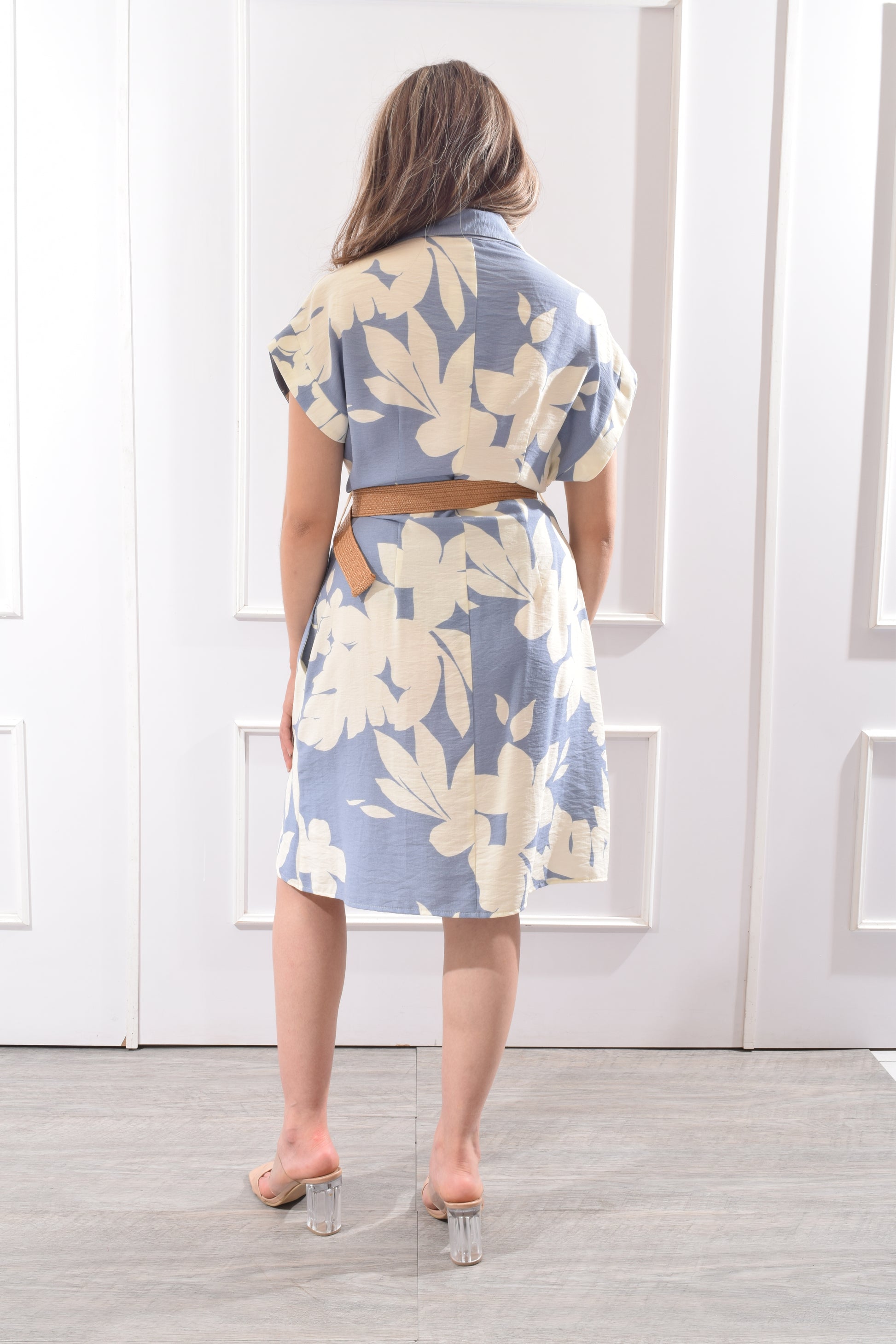 Vestido estampado botones al frente, manga corta, cinto rafia, tela sin strech.