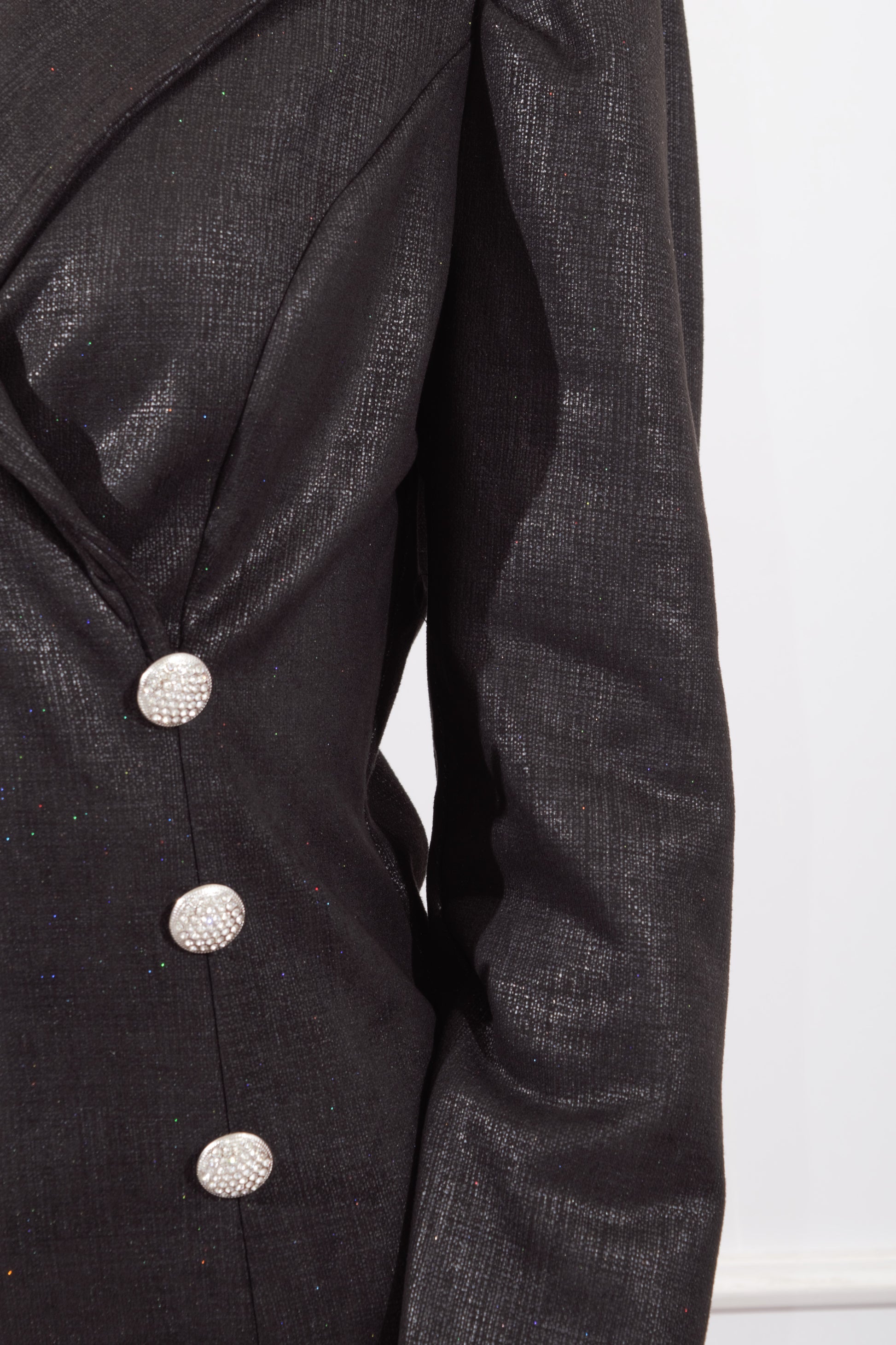Vestido manga larga, botones plateado con brillos, tela muy suave con pequeños destellos de brillo, tela con suficiente strech.