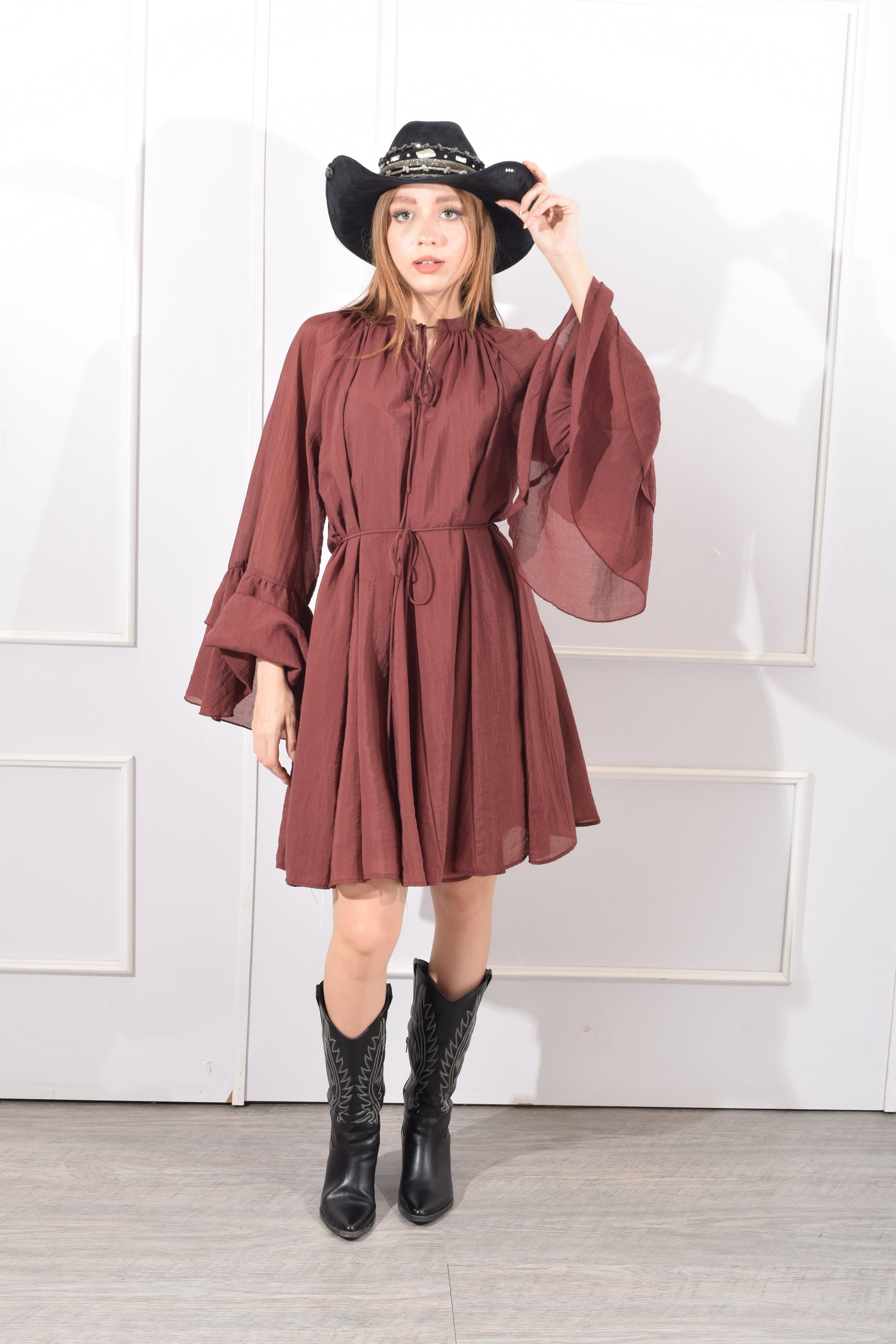 Vestido amplio manga campana, tiene forro, cinto tela.